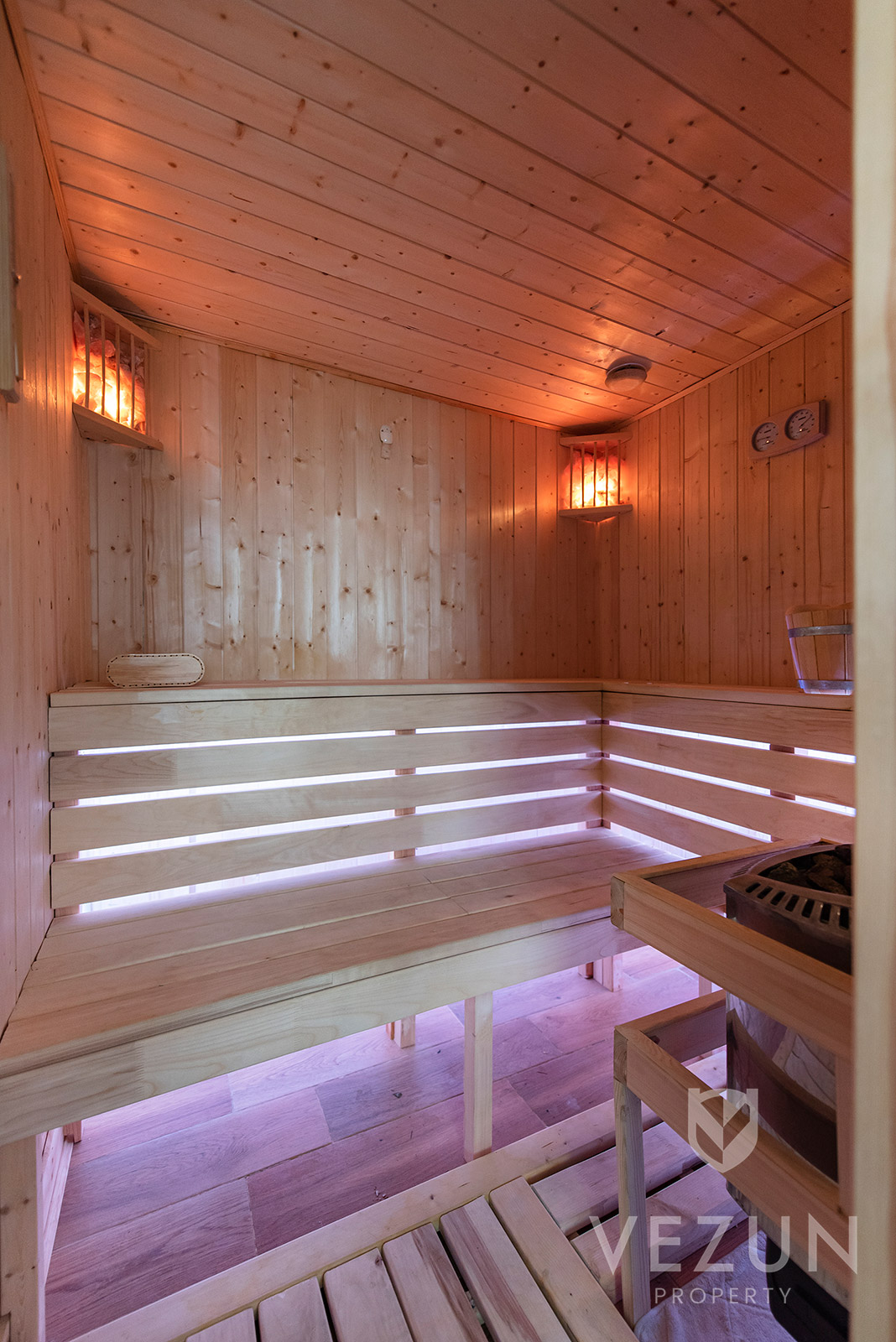 - Sauna z piecem Harvia 9KW ze sterownikiem Harvia CM80, lampami solnymi i koloroterapią, zasilanie siłowe (nagrzewanie do temp 80st w 30 minut)