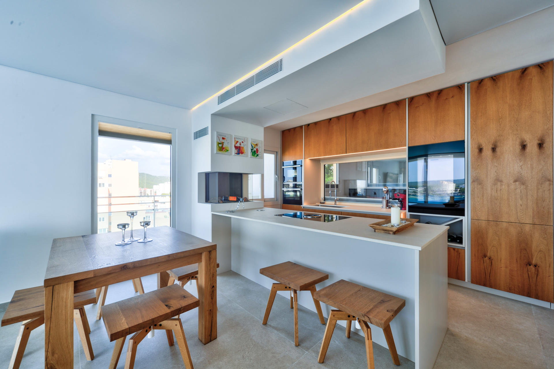 Wkraczając do tego wyjątkowego wnętrza natychmiast oczarowuje nas atmosfera spokoju i harmonii. Duże okna otwierające się na morze przepuszczają obfite ilości naturalnego światła, które rozświetla każdy kąt tego przestronnego domu. Kolory użyte do wystroju wnętrza tworzą kompozycję, która emanuje nowoczesnym minimalizmem i elegancją, a drewniane elementy, dodają ciepła i przytulności. Całość tworzy doskonałą harmonię, gdzie nowoczesny minimalizm łączy się z przytulnością i funkcjonalnością. Wnętrze jest przemyślane w najdrobniejszych szczegółach, a starannie dobrane meble i dodatki tworzą spójną estetykę.