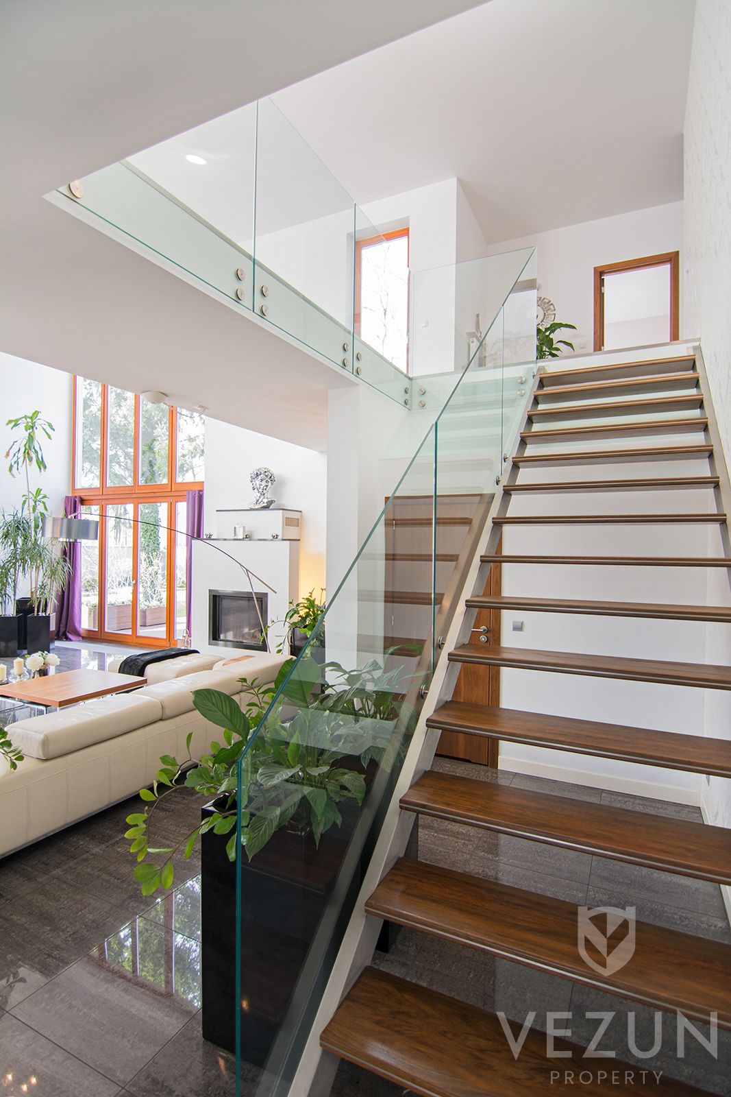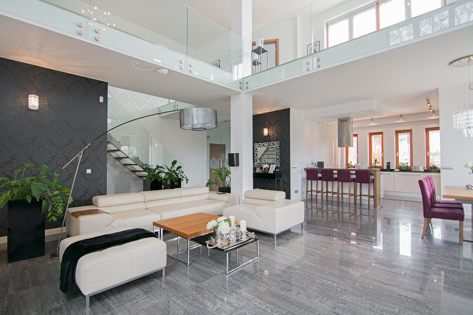 Na wszystkich podłogach parteru zastosowano kamień. Ciągi komunikacyjne otwarte, przestronne i dobrze rozplanowane. Schody nowoczesne z drewnianymi podestami.
