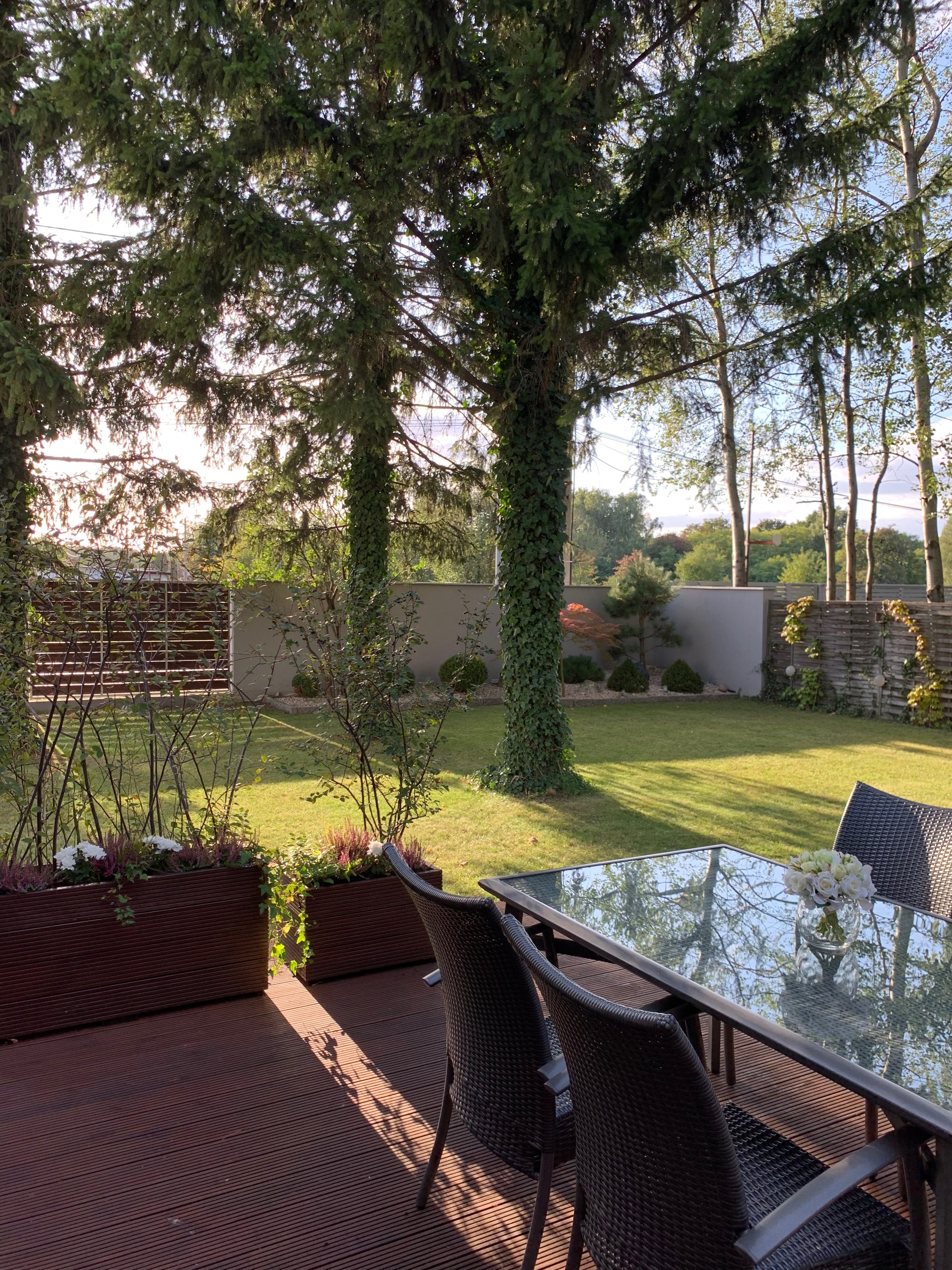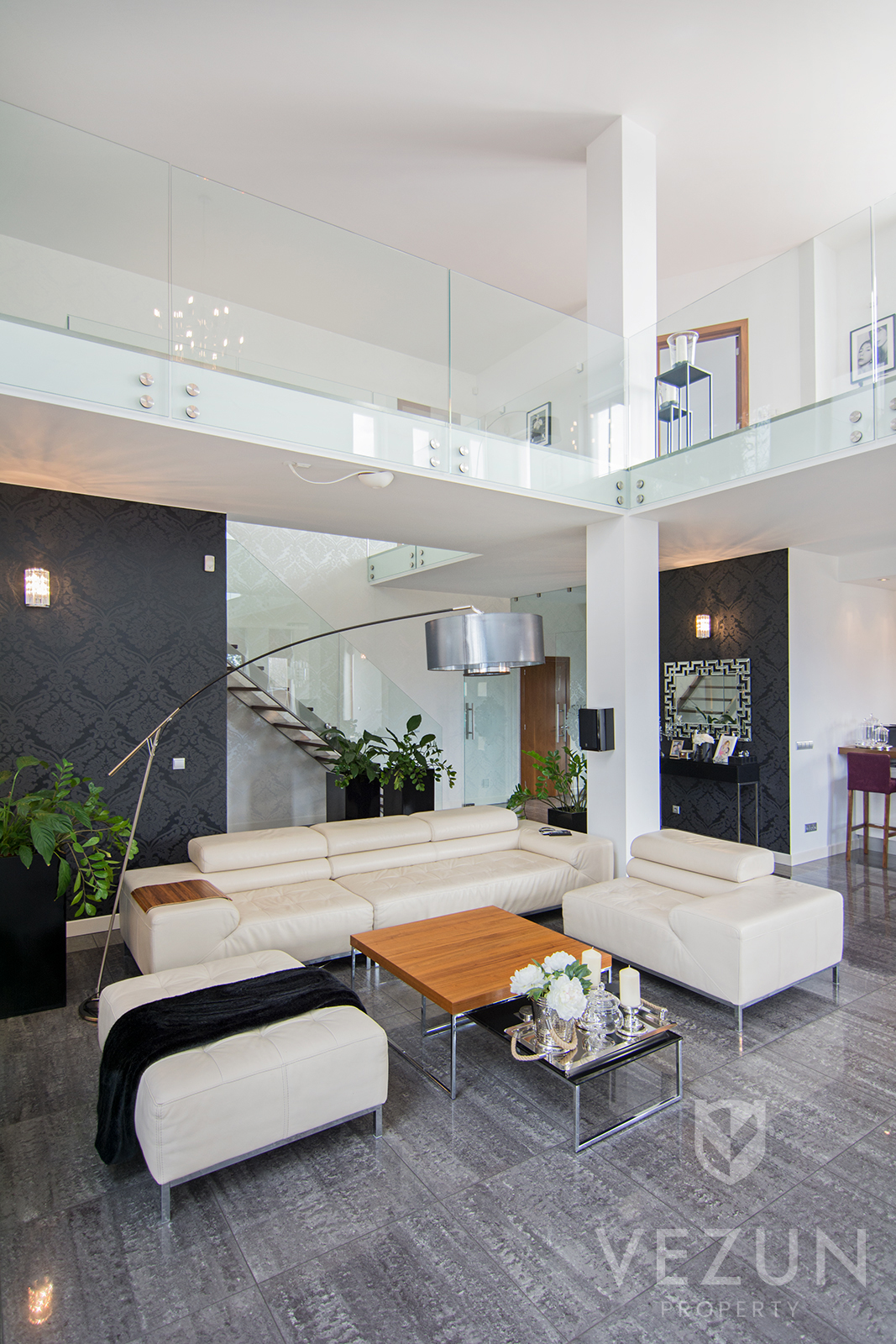 Elegancka kuchnia w zabudowie wyposażona została w najwyższej klasy sprzęt AGD. Salon wysoki na 2 kondygnacje, to pęknie doświetlona przestrzeń, w której właściciele wydzielili miejsce na jadalnię i strefę wypoczynku. Łączy w sobie szyk i elegancję, został zaprojektowany tak, by zachęcać do relaksu. Bezpośrednio z salonu wyjdziemy na duży taras – idealny na poranną kawę.