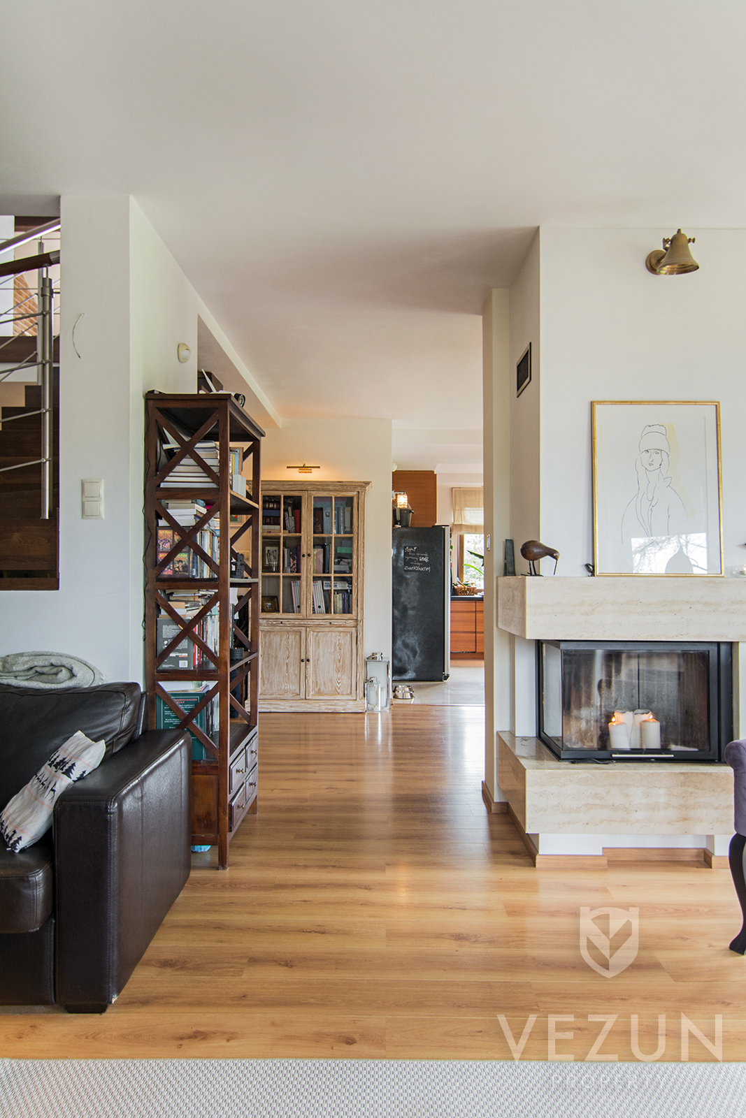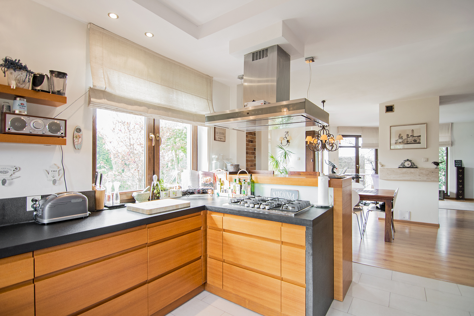 Elegancka kuchnia w zabudowie wyposażona została w najwyższej klasy sprzęt AGD (lodówka , zmywarka, piekarnik). Salon to dobrze doświetlona przestrzeń, w której właściciele wydzielili miejsce na jadalnię i strefę wypoczynku. Łączy w sobie szyk i elegancję, został zaprojektowany tak, by zachęcać do relaksu. Piętro domu to strefa prywatna.