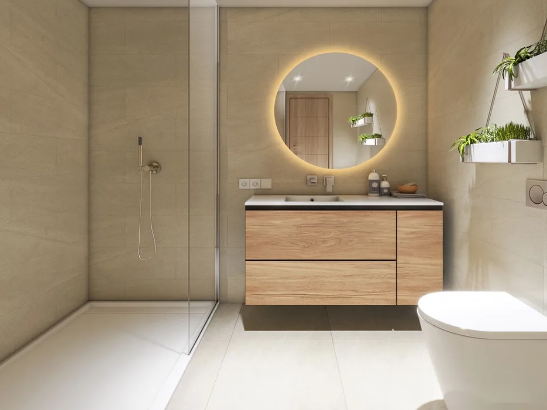 W łazienkach przewidziano eleganckie, podwieszane drewniane szafki z jedną lub dwiema umywalkami (w zależności od projektu), prysznic z płaskim brodzikiem oraz wysokiej jakości armaturę wpuszczaną w ściany, marki Tres.