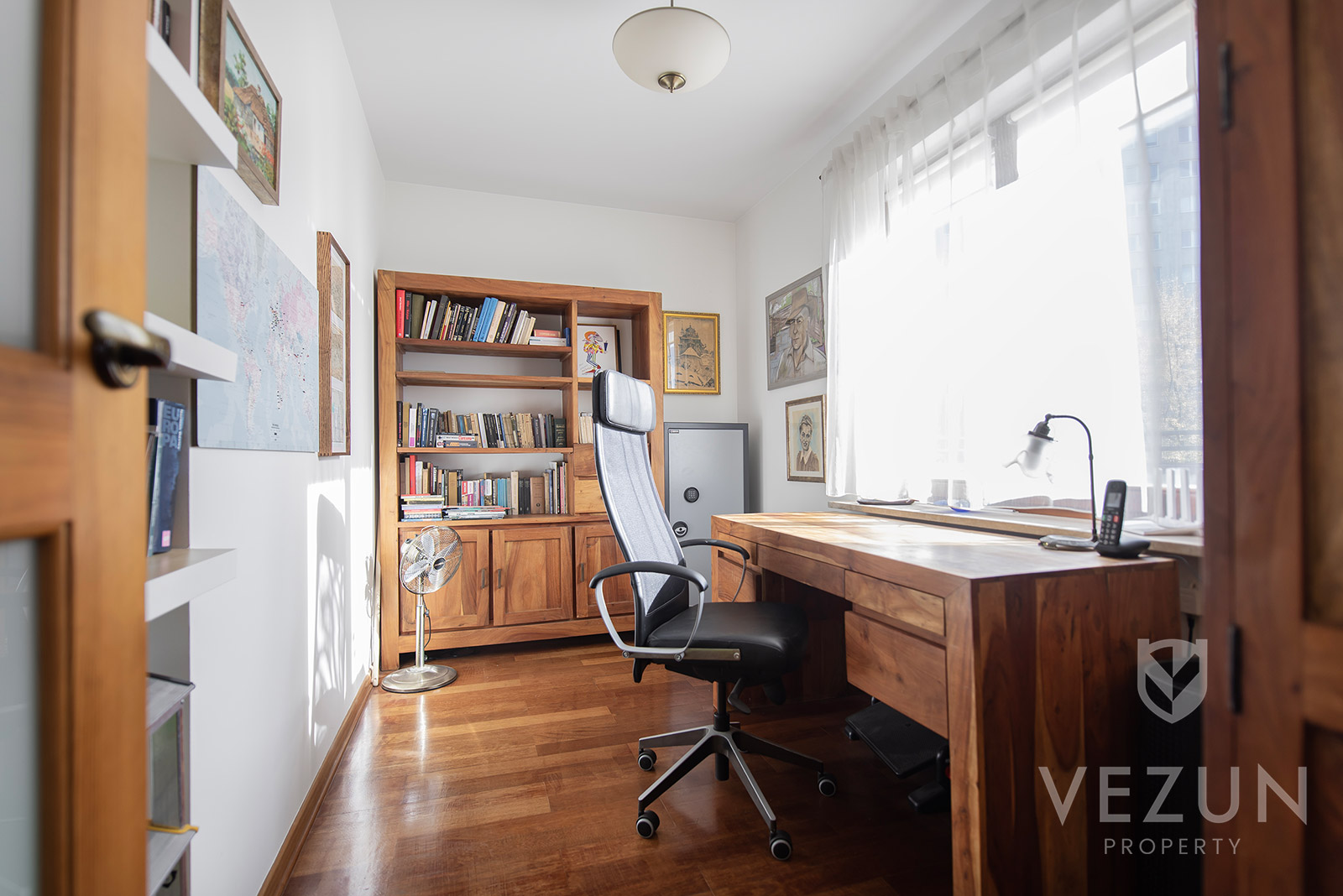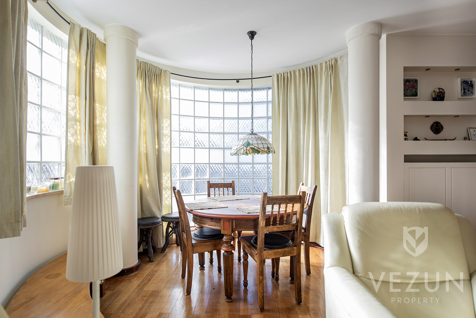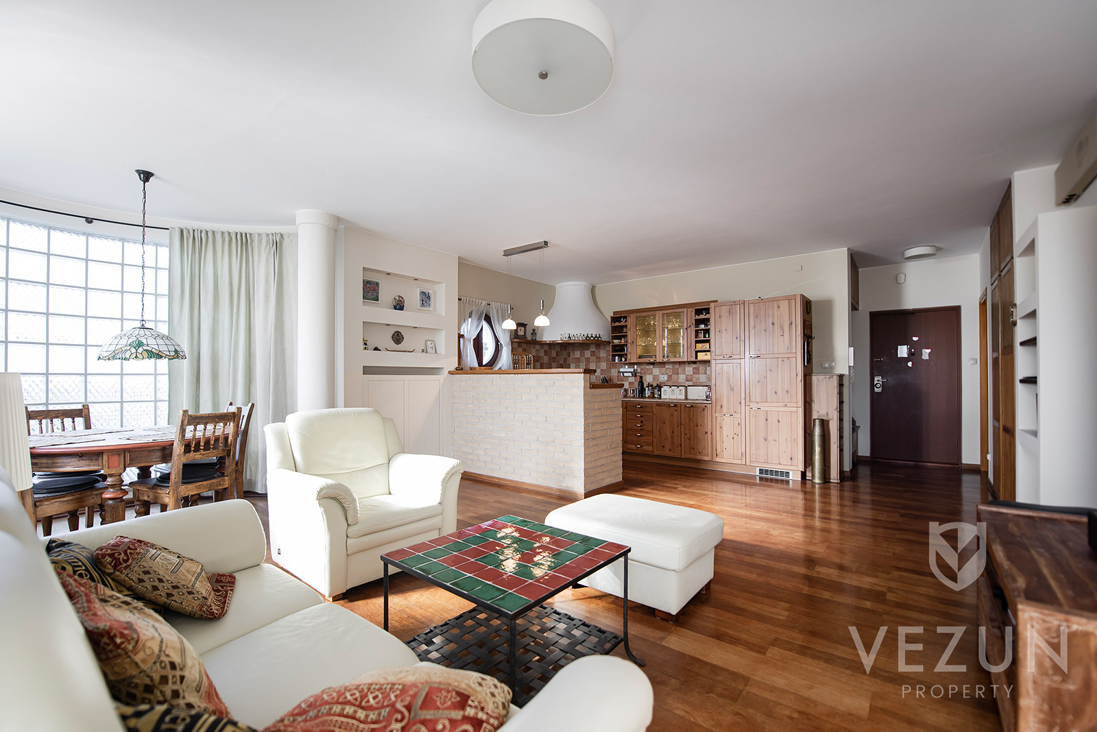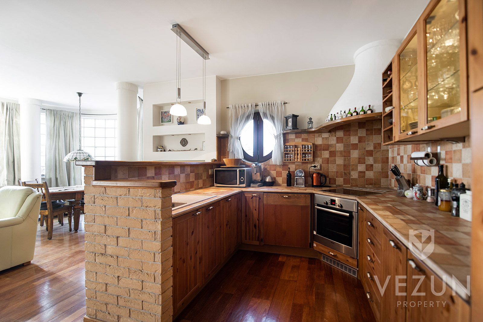 Stylowy, klasyczny apartament zachwyca przytulną atmosferą, którą podkreślają liczne drewniane akcenty oraz otwarta, przestronna aranżacja wnętrza. Duże okna, wychodzące na trzy strony świata, wpuszczają obfite ilości naturalnego światła przez cały dzień. Apartament posiada przestronny, 100-metrowy taras, idealny na relaks i spotkania towarzyskie na świeżym powietrzu. Dodatkowo taras stanowi naturalne przedłużenie salonu, oferując widoki na zieleń oraz bliski kontakt z naturą przez cały rok.