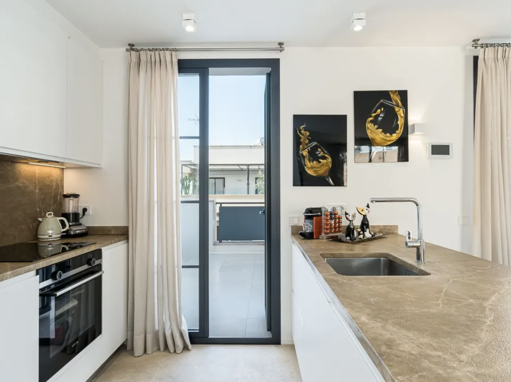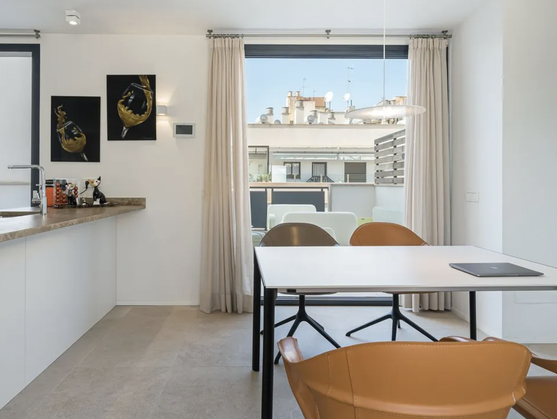 Penthouse rozciąga się na dwóch poziomach mieszkalnych, w których znajdują się dwie przestronne sypialnie z prywatnymi tarasami, dwie eleganckie łazienki, jasny salon połączony z jadalnią, w pełni wyposażona kuchnia oraz imponujący taras na dachu. Stamtąd rozpościera się zapierający dech w piersiach widok na tętniące życiem miasto, który sprawia, że każda chwila spędzona na świeżym powietrzu staje się niezapomnianym doświadczeniem.