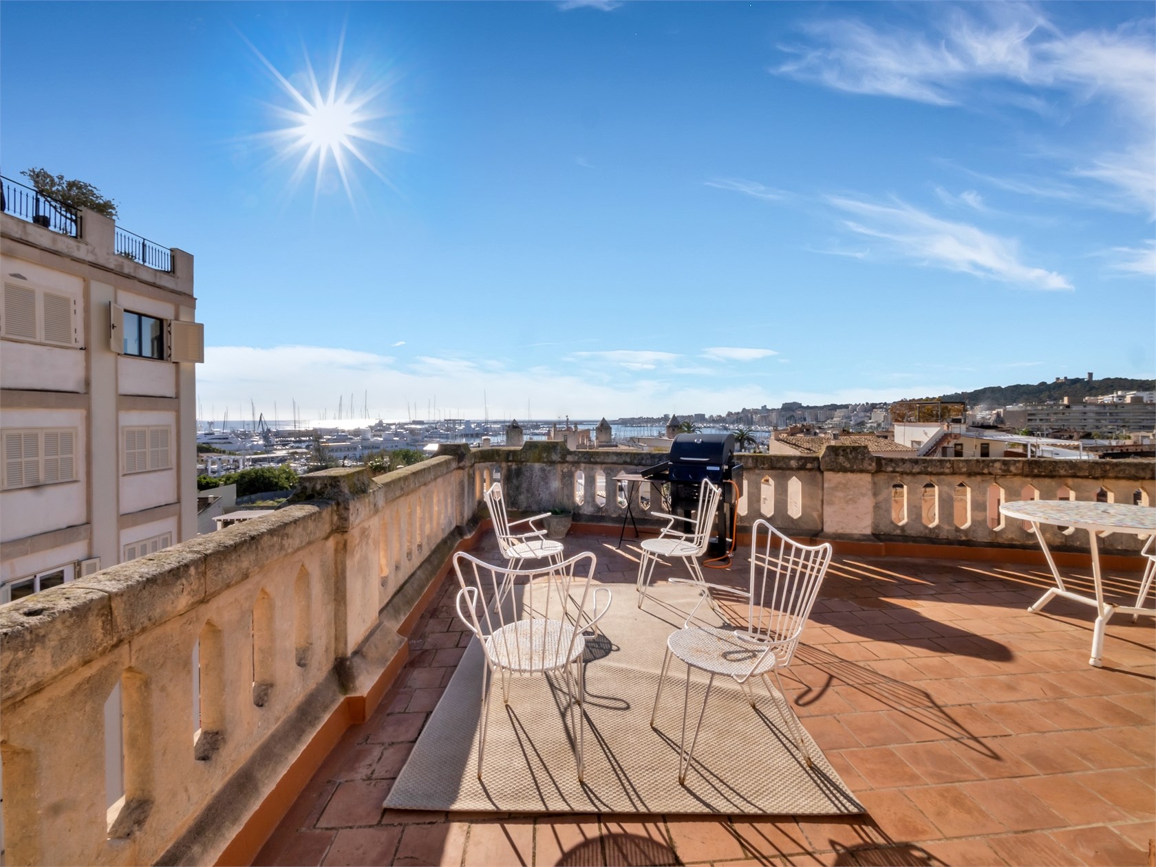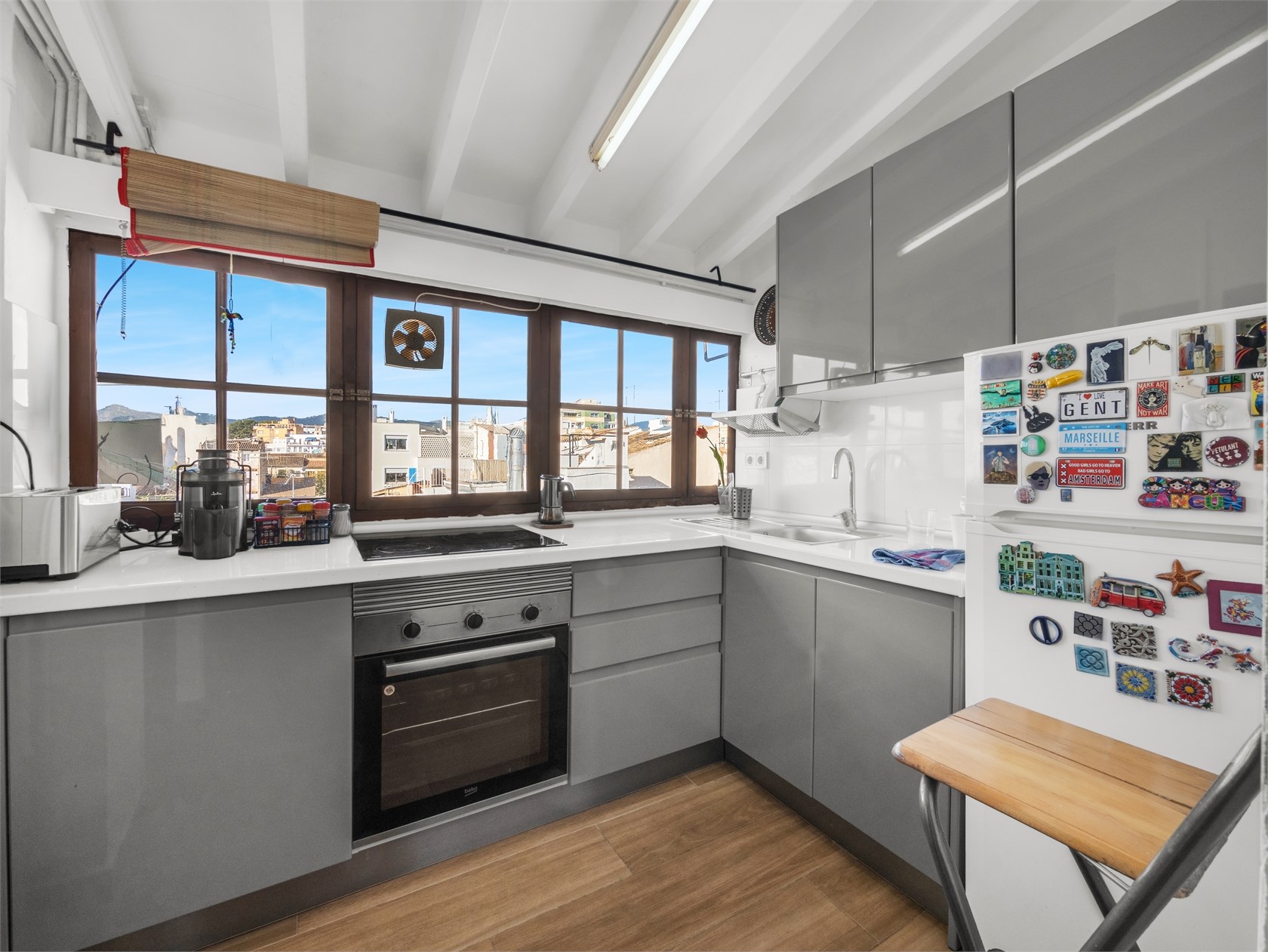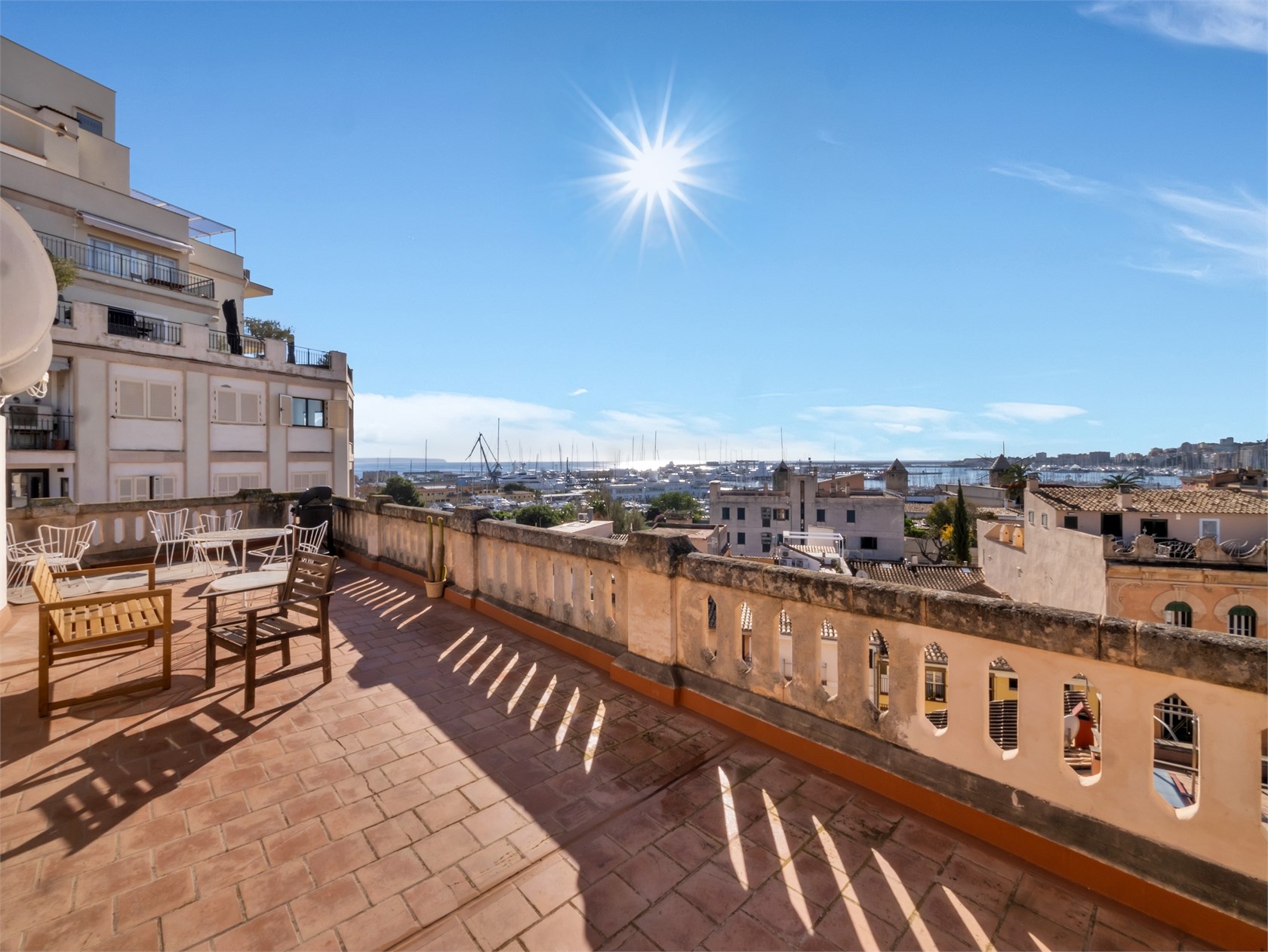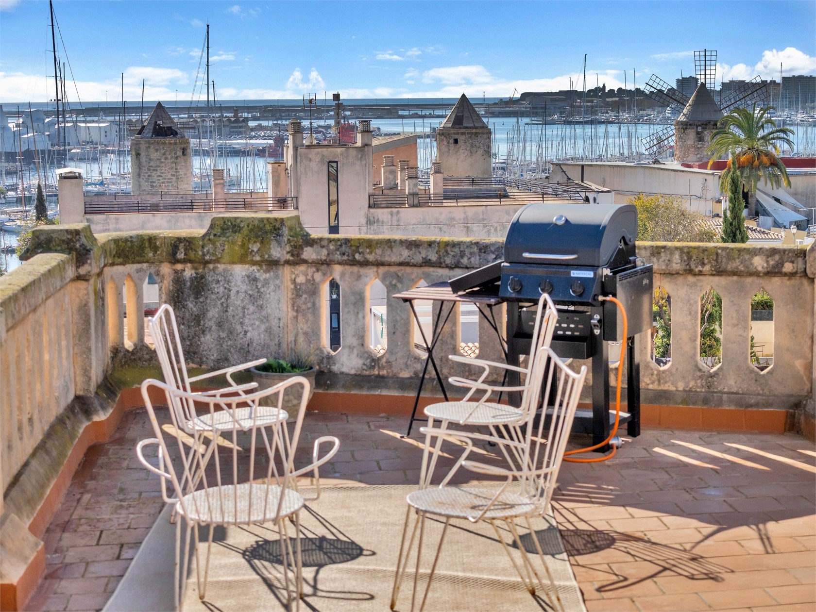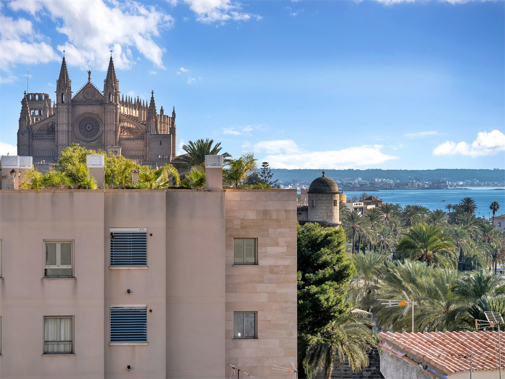 Apartament mieści się na czwartym, ostatnim piętrze w kamienicy z 1900 roku w popularnej dzielnicy Santa Catalina, z największą ofertą gastronomiczną w mieście, przy cichej ulicy w pobliżu rynku i zaledwie pięć minut od centrum Palmy.