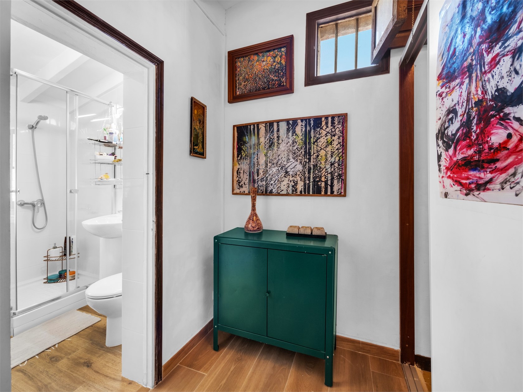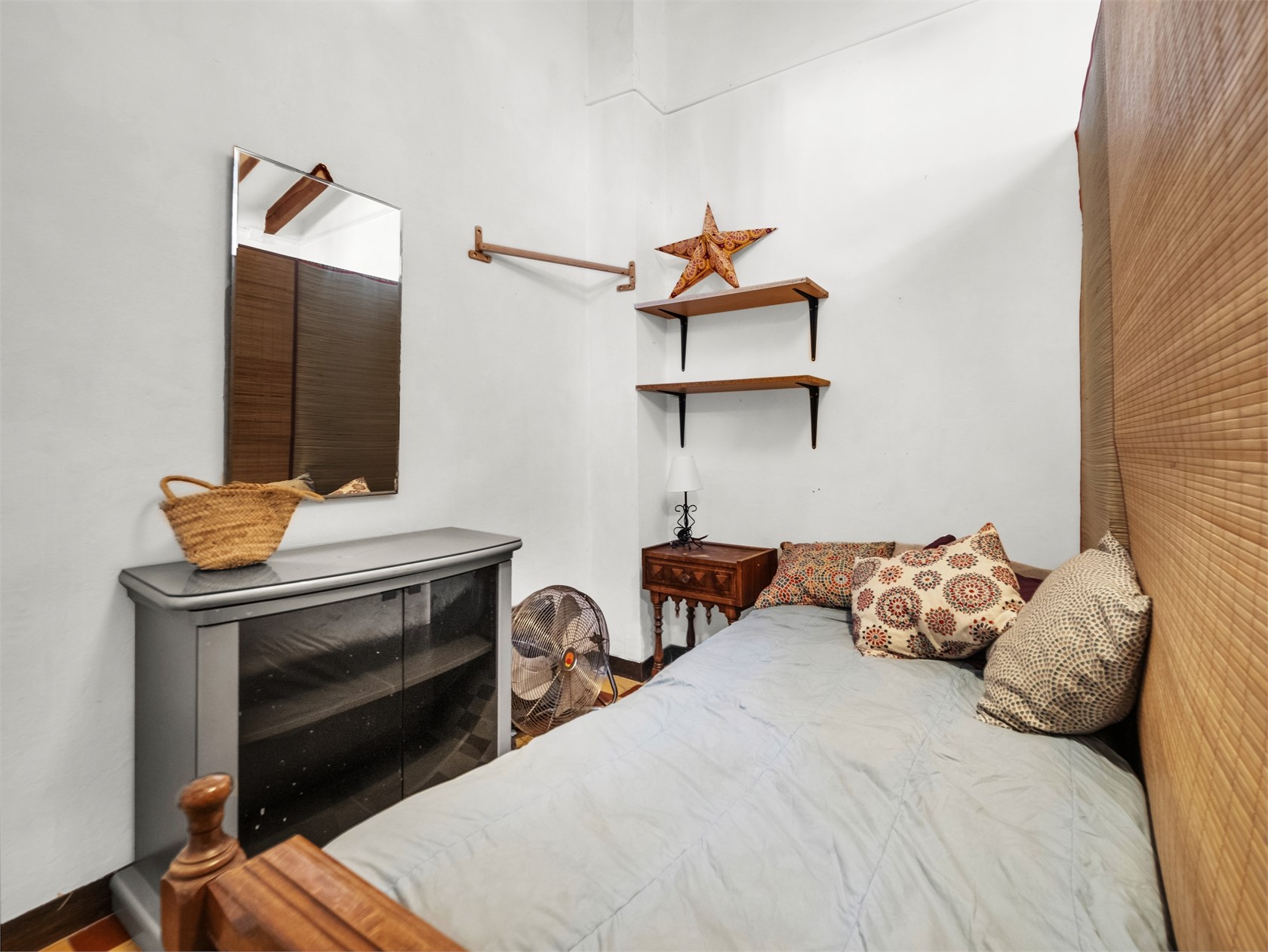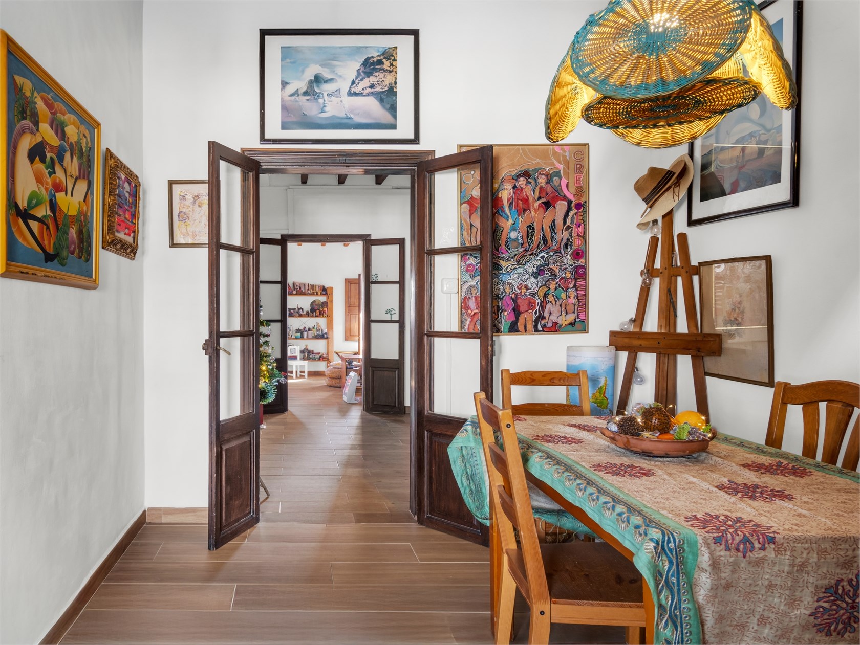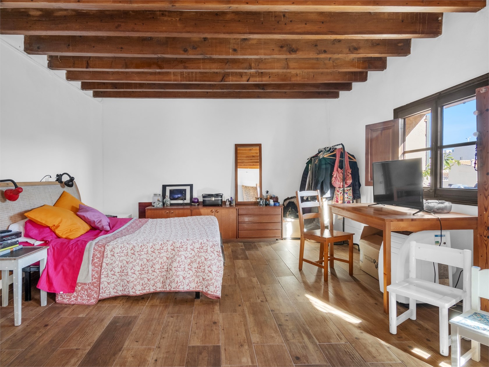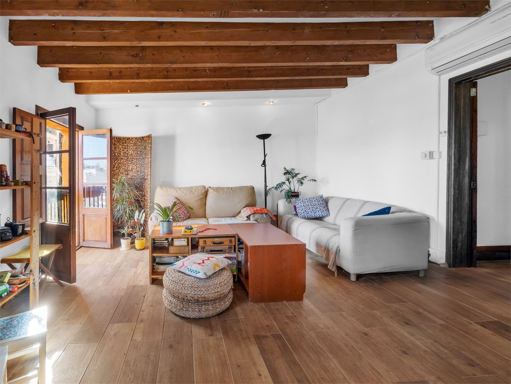 Przytulny apartament o majorkańskim charakterze. Mieszkanie znajduje się w starszej kamienicy z piękną, oryginalną klatką schodową wykonaną z drewna i płytek. W mieszkaniu zachowano drewniane belki stropowe i ramy okienne. Apartament składa się z salonu, kuchni, holu, dwóch sypialni oraz łazienki. Mieszkanie ma piękny widok na Bellverslottet.