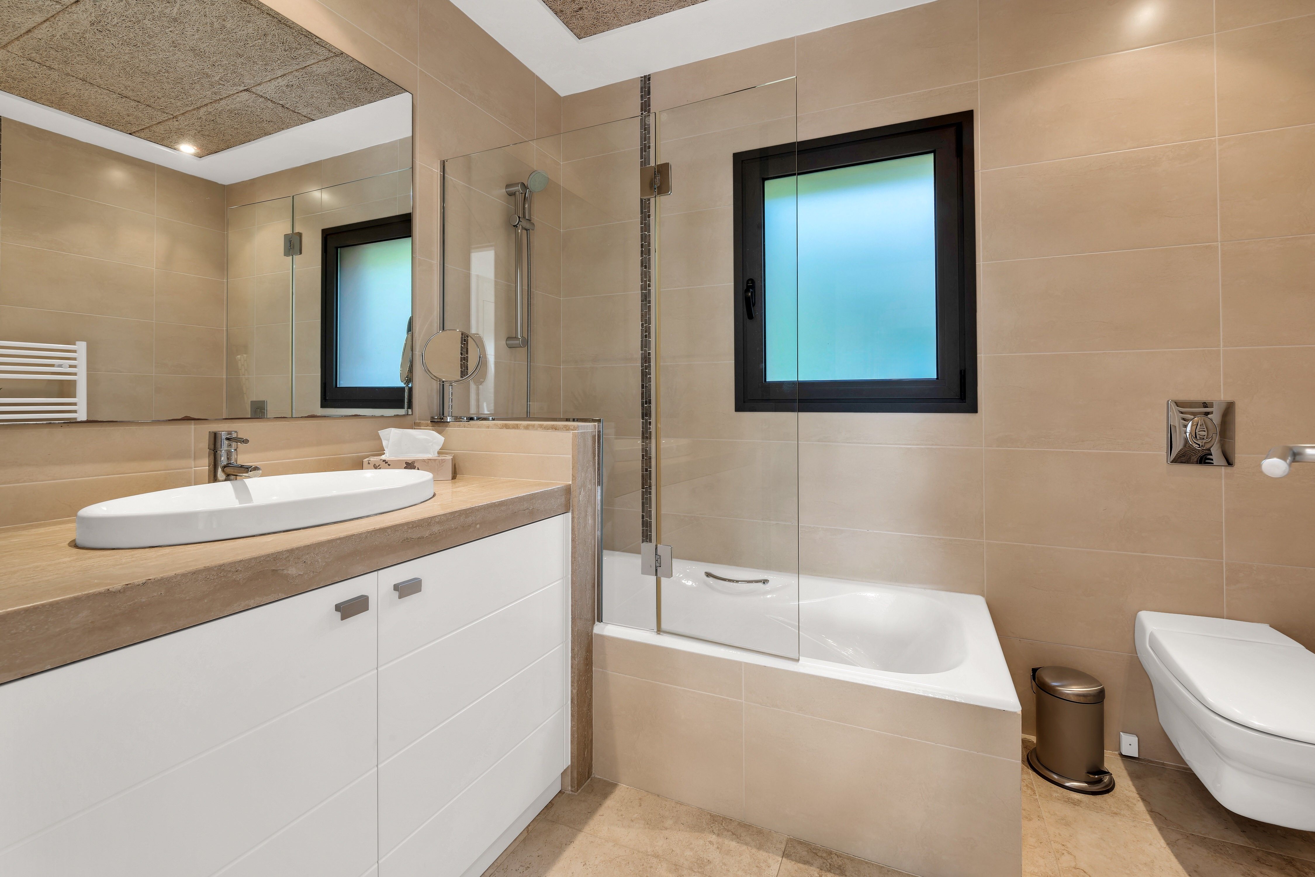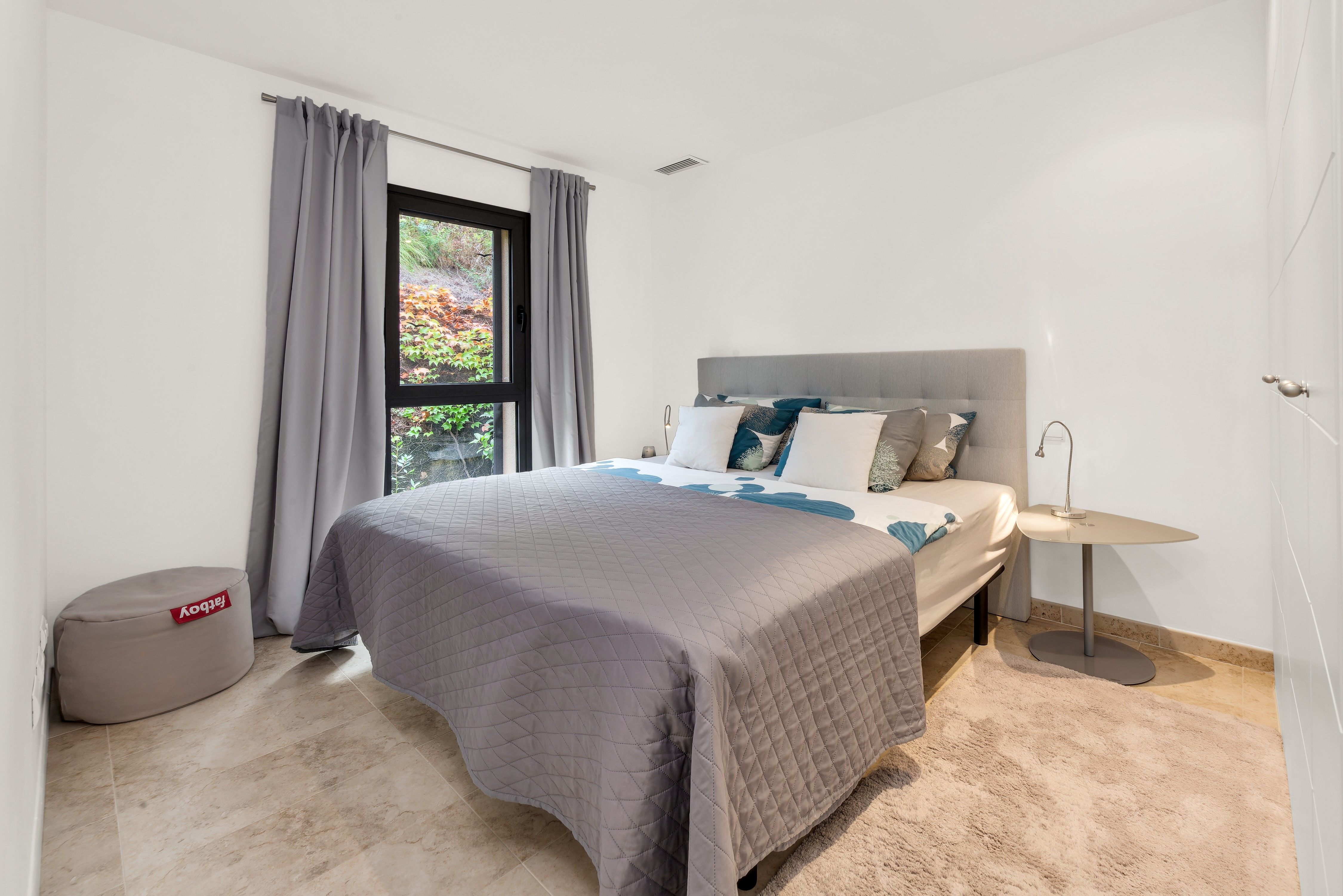 W apartamencie zadbano o każdy detal, kamienne podłogi dodają wnętrzu elegancji, a centralna klimatyzacja zapewnia komfort o każdej porze roku. Obie łazienki wyposażone są w podgrzewane wieszaki na ręczniki, co zwiększa wygodę codziennego użytkowania. Ukryty schowek pełni funkcję praktycznej pralni, mieszcząc pralkę, suszarkę bębnową i dodatkowe miejsce do przechowywania.
