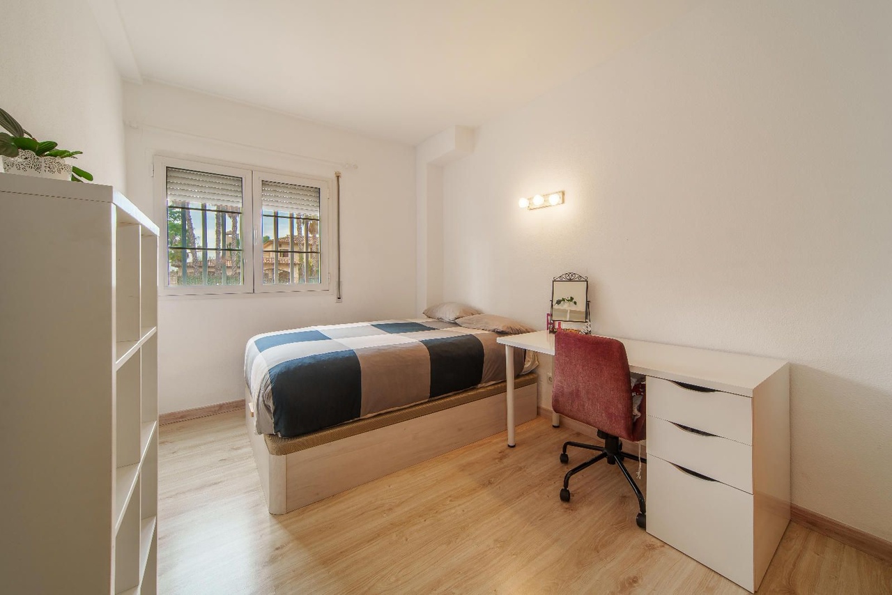Ten przestronny apartament mieści się na parterze w zadbanym budynku mieszkalnym z basenem i parkingiem.