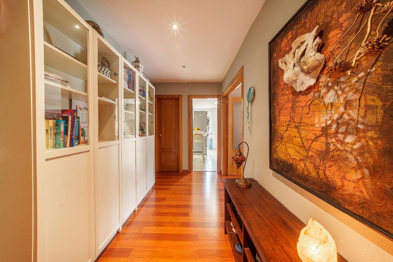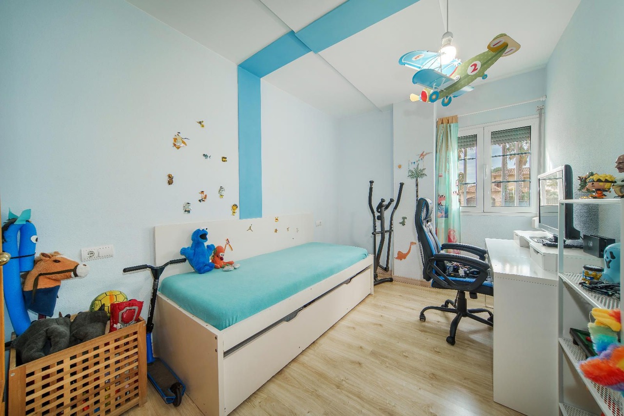 Apartament posiada klimatyzację, okna z podwójnymi szybami, metalowe rolety oraz eleganckie wykończenia – parkiet oraz podłogę wyłożoną gresem.