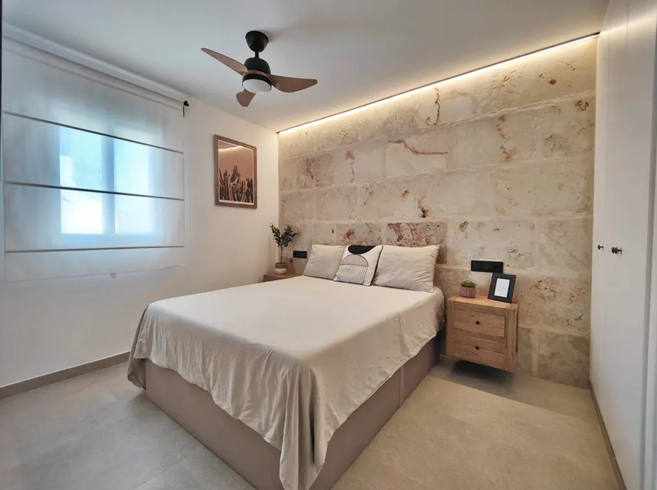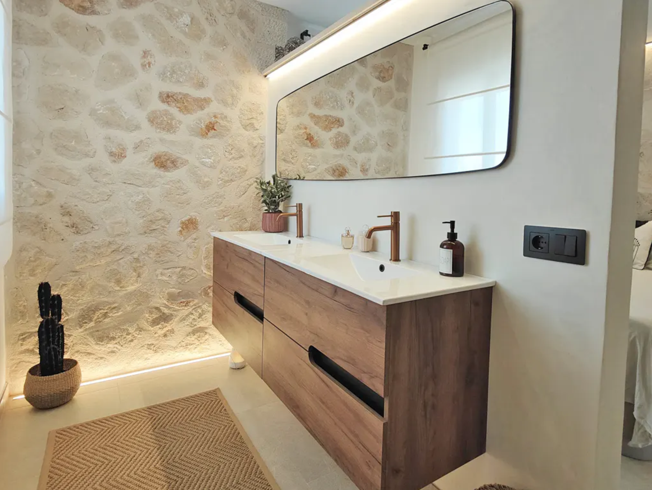Dodatkowym udogodnieniem na parterze jest toaleta dla gości. Wnętrze domu wyróżnia się dbałością o detale, użyty kamień Santanyi, odsłonięte belki przy schodach oraz nowoczesne, wpuszczane oświetlenie LED, tworzą przytulny klimat na każdym piętrze.