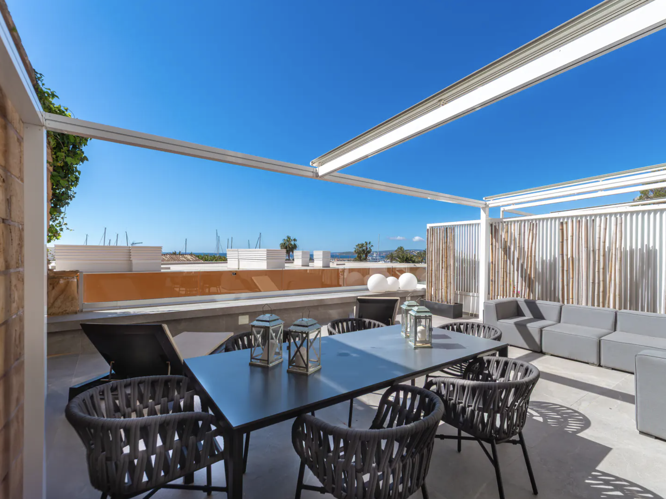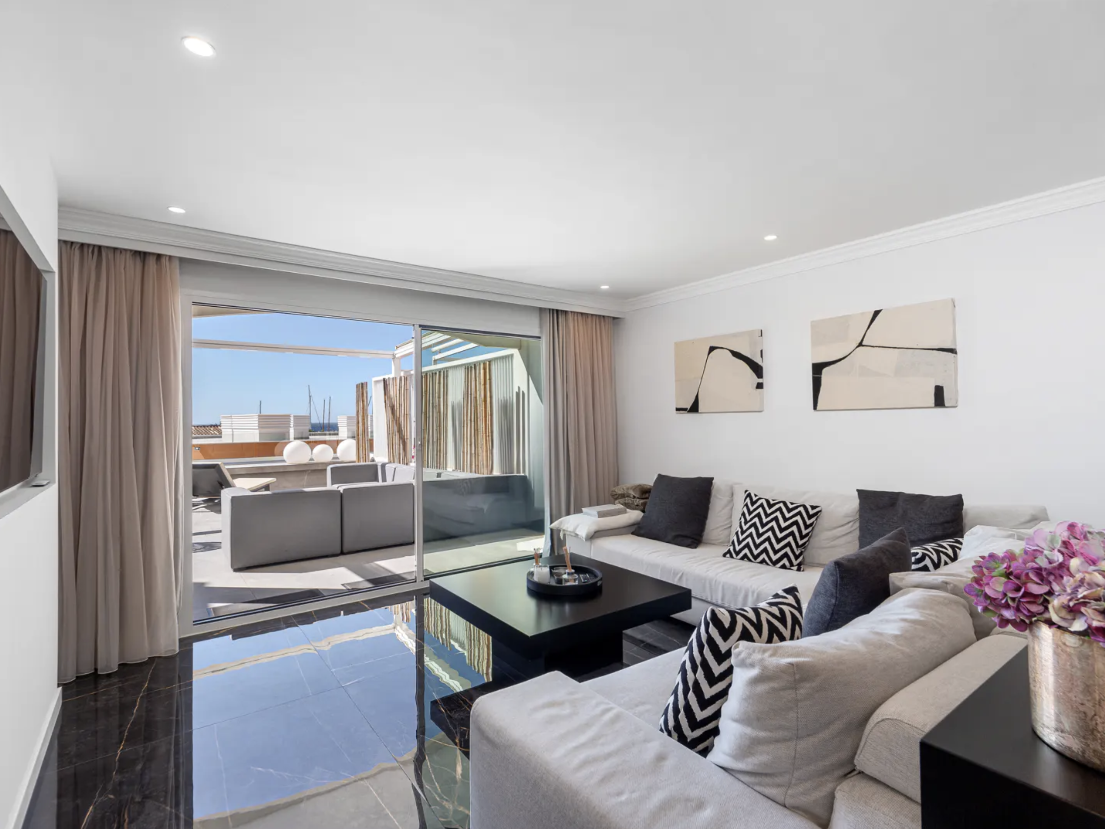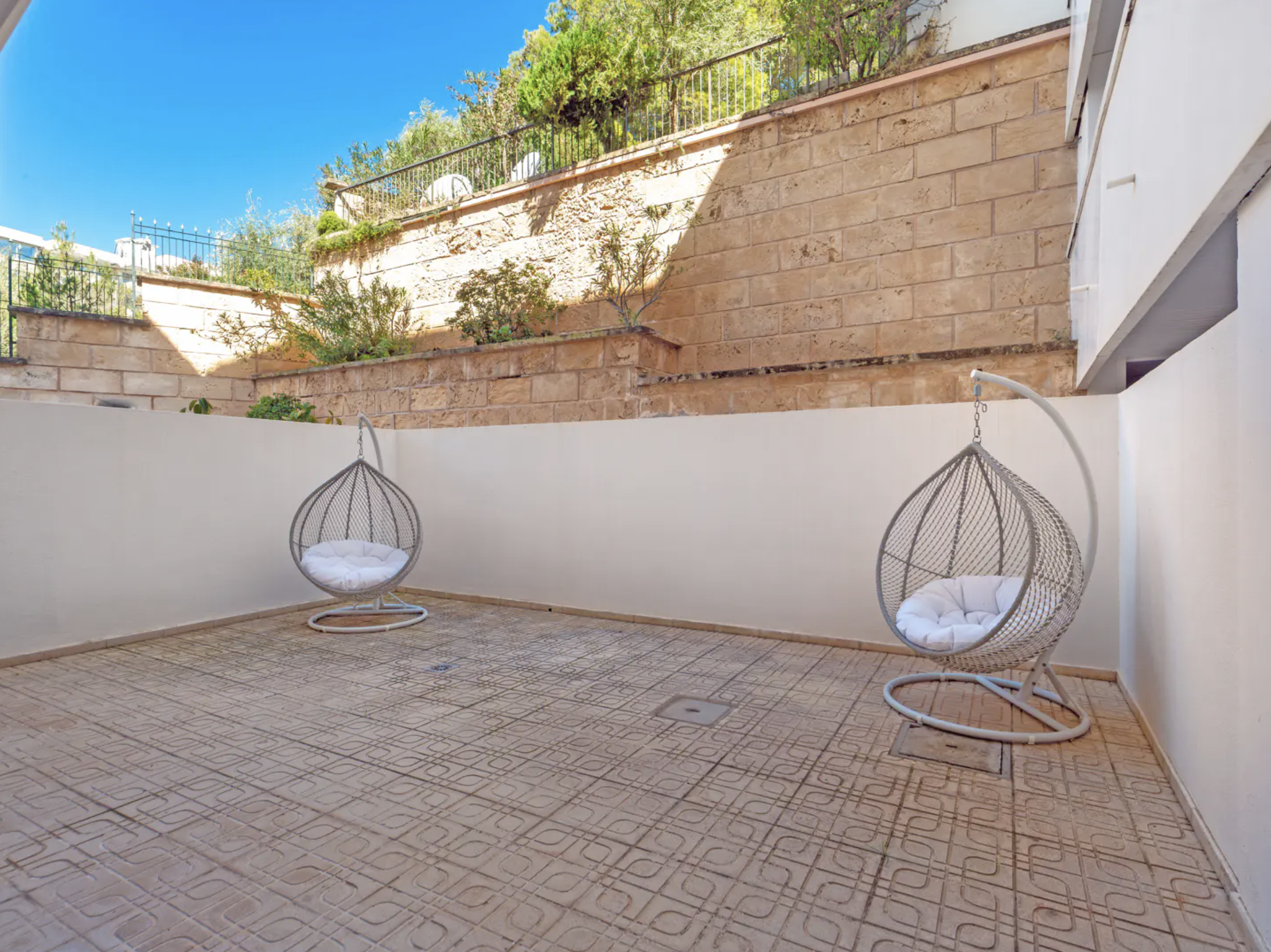 – Południowy taras o powierzchni około 70mkw, dostępny z salonu oraz głównej sypialni, oferuje idealne warunki do relaksu, posiłków na świeżym powietrzu i cieszenia się śródziemnomorskim klimatem.