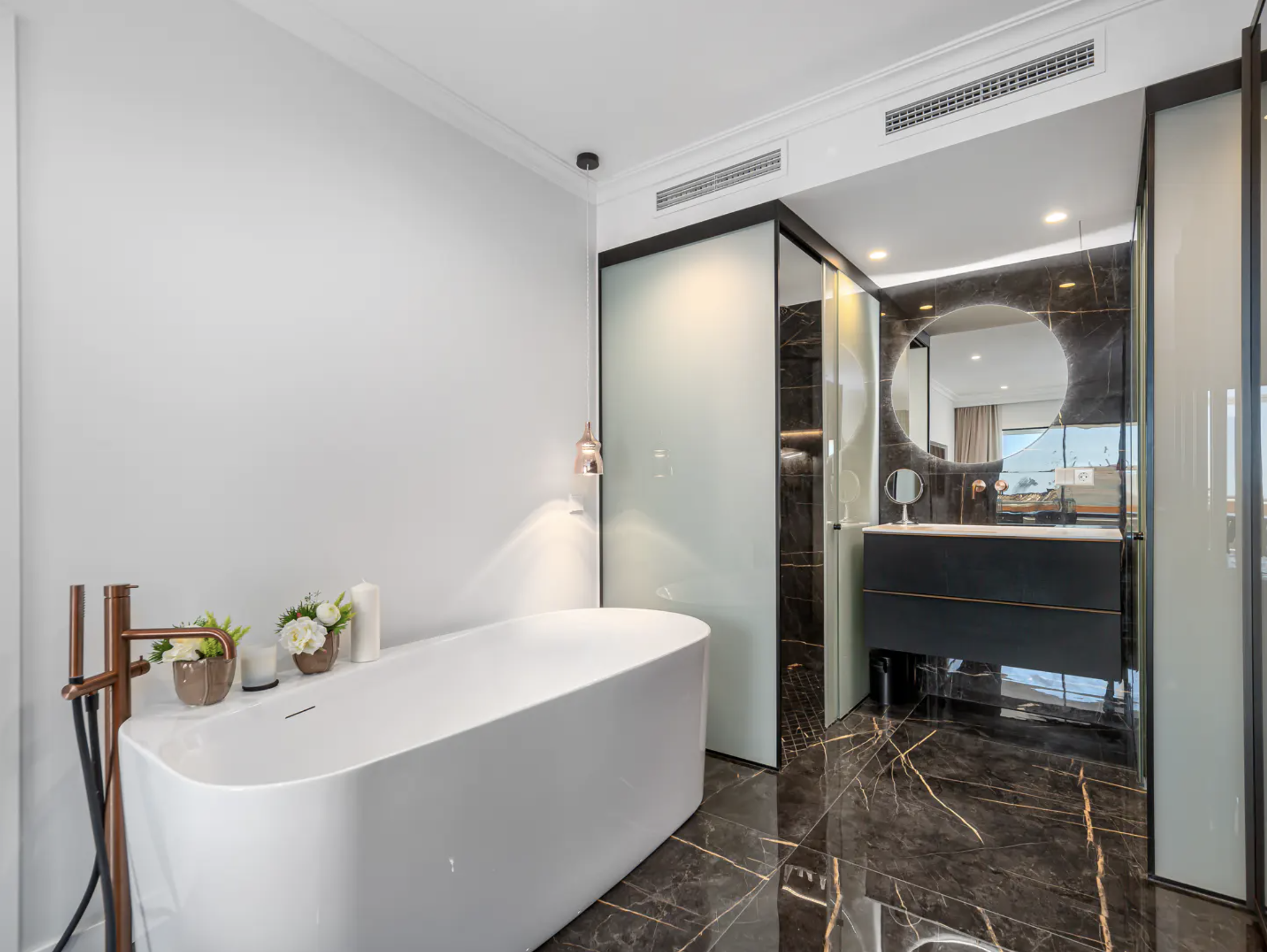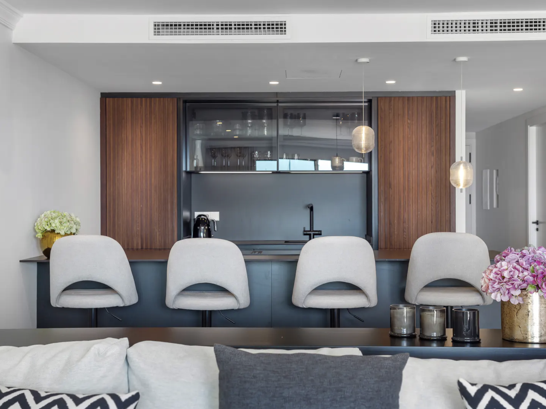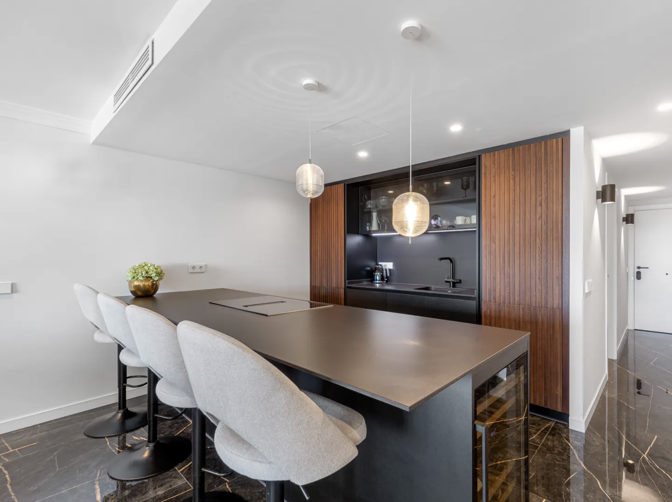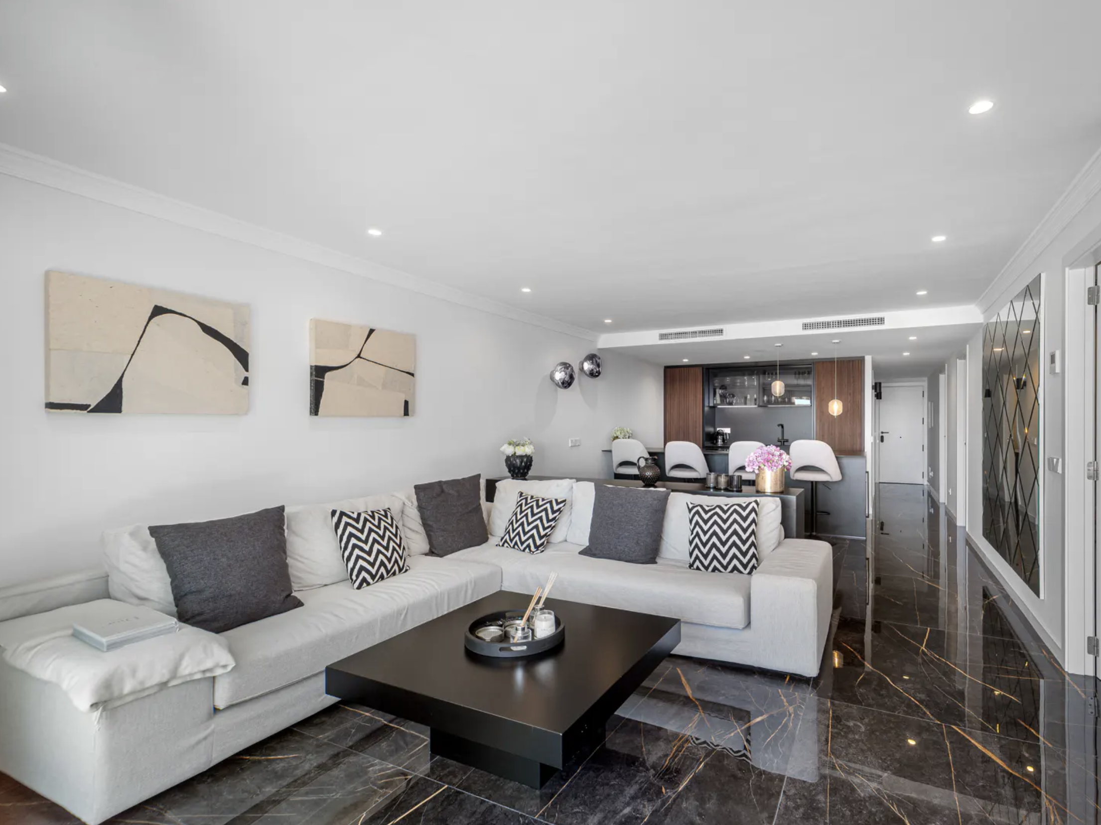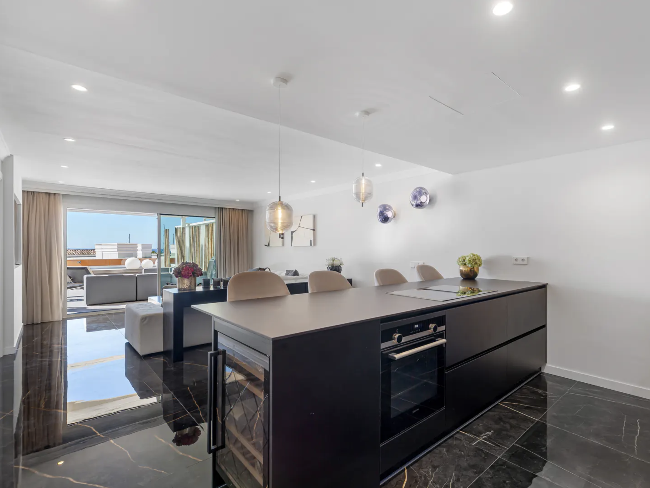 Stylowo odnowione wnętrze apartamentu z trzema sypialniami zostało zaprojektowane z myślą o nowoczesnym stylu życia. Otwarty plan przestrzeni dziennej obejmuje przestronny salon i dużą, centralnie położoną wyspę kuchenną, tworząc idealne miejsce do wspólnego spędzania czasu. Wysokiej jakości wykończenia podkreślają elegancję i komfort całego wnętrza.