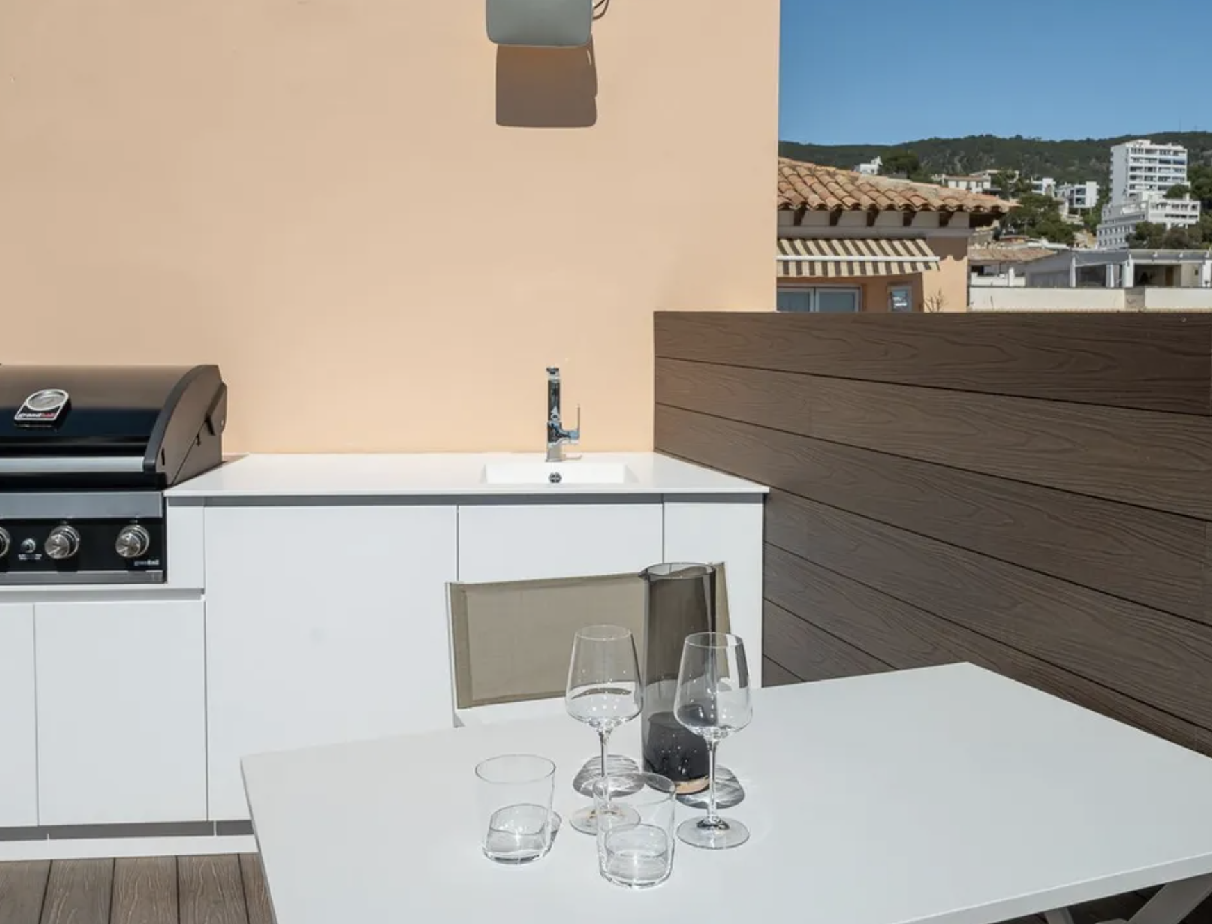 Luksusowa nieruchomość oferuje dwie sypialnie z pojemnymi, zabudowanymi szafami, z czego główna sypialnia dysponuje prywatną łazienką oraz wyjściem na własny taras. Do dyspozycji mieszkańców są dwie w pełni wyposażone łazienki wykończone meblami renomowanej marki Butó. Przestronna kuchnia, zaprojektowana na zamówienie, zachwyca nowoczesnym designem i wysokiej klasy sprzętem AGD, płynnie łącząc się z dużym salonem z jadalnią.