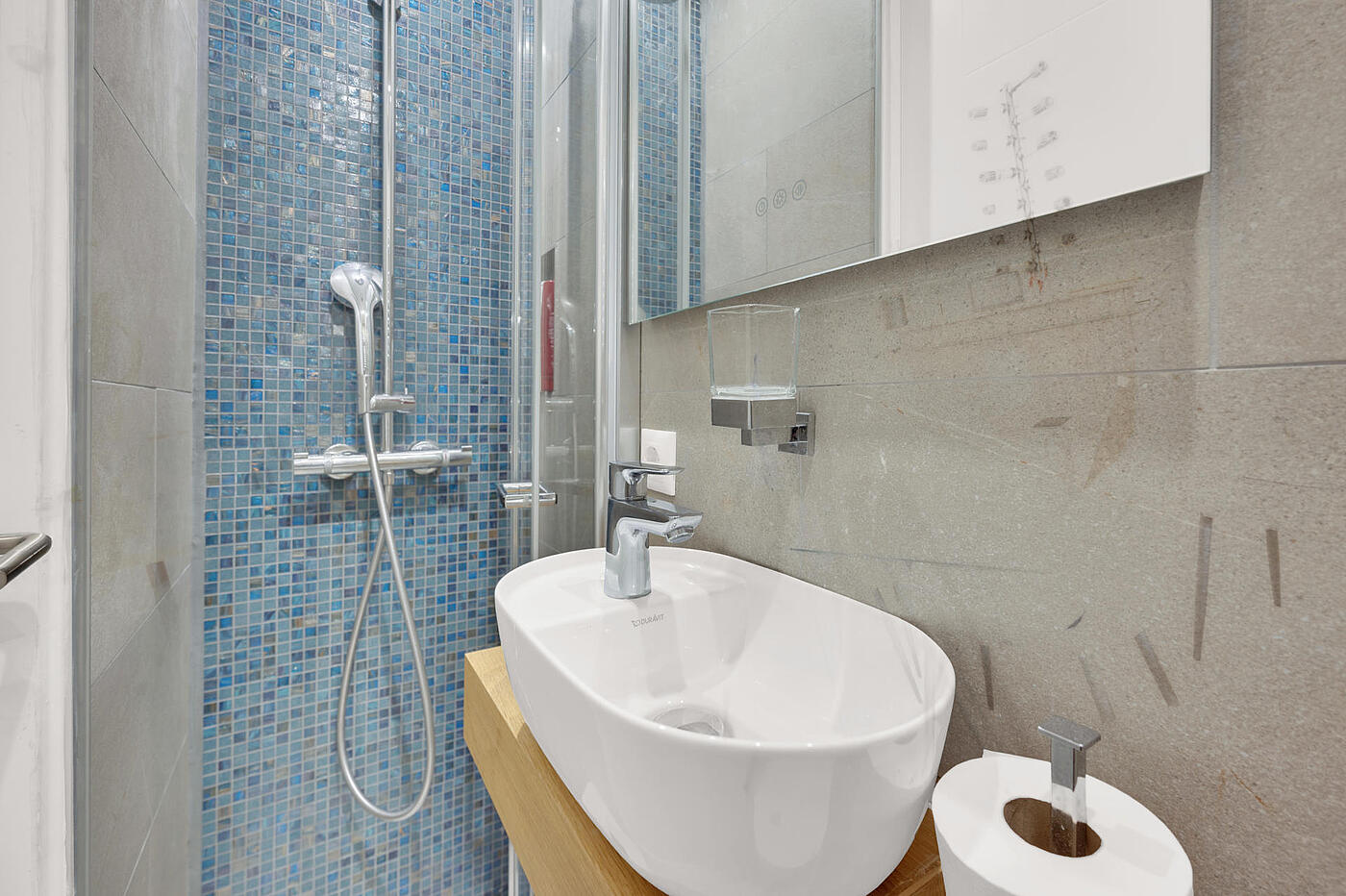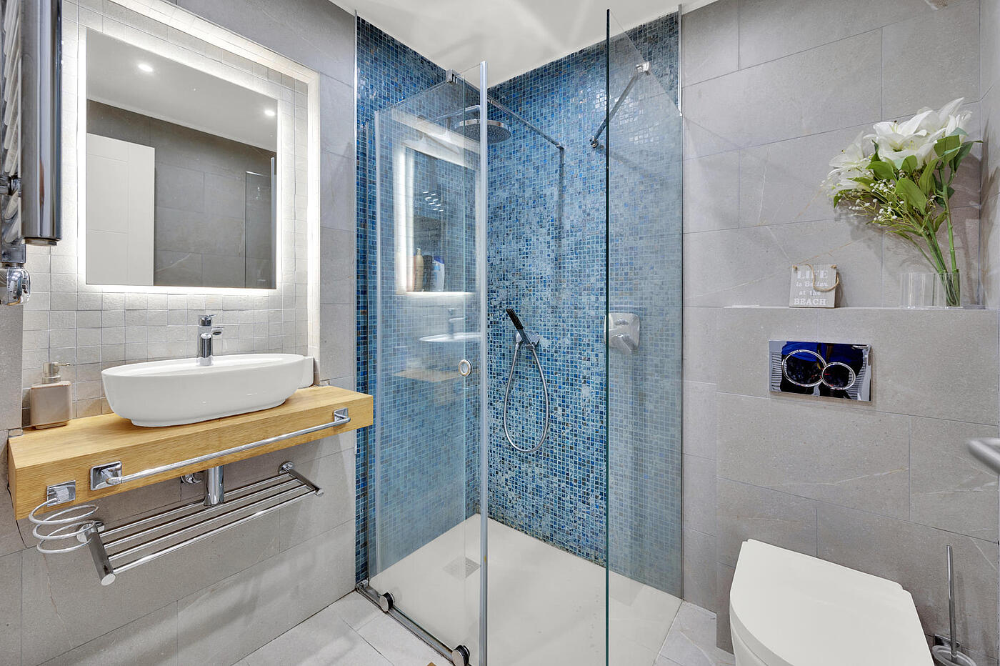 Apartament zachwyca nowoczesnym wykończeniem i przemyślanym układem wnętrz. Po wejściu do środka wita nas przestronny korytarz z wbudowanymi szafami. Po prawej stronie znajduje się pierwsza sypialnia, natomiast po lewej, korytarz prowadzący do oddzielnej łazienki oraz kolejnej sypialni z własnym dostępem do dużego tarasu oraz prywatnej, kompaktowej łazienki z toaletą.