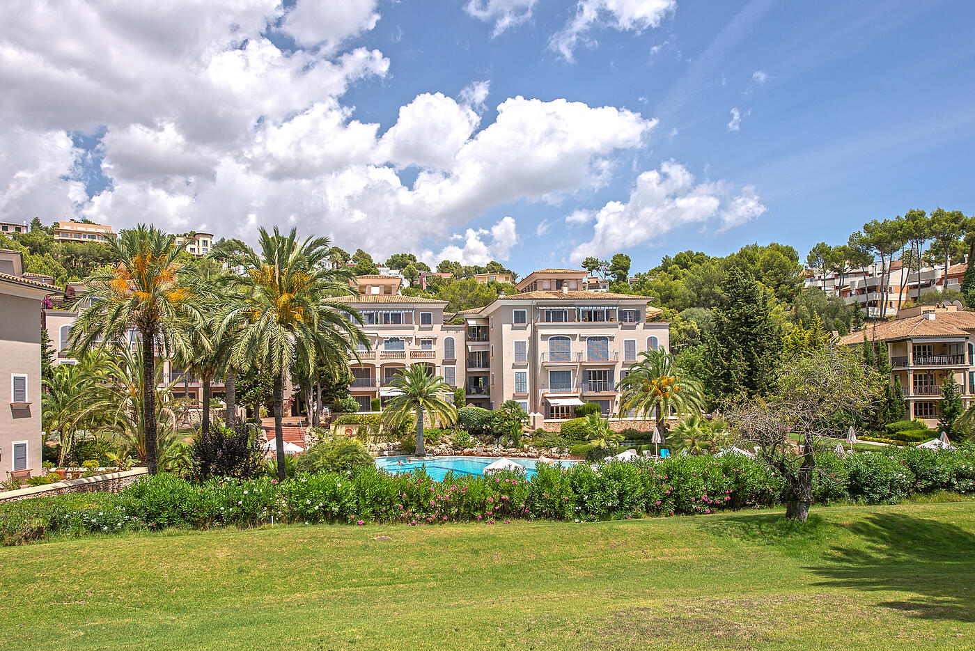 Ten zmodernizowany apartament położony jest w prestiżowym kompleksie mieszkalnym Bendinat Golf, usytuowanym na zachodnich obrzeżach Palmy. Nieruchomość wyróżnia się bezpośrednim dostępem do pola golfowego Real Golf de Bendinat oraz panoramicznymi widokami na jego zieleń. Zadbane otoczenie kompleksu obejmuje rozległe ogrody, zewnętrzny basen z wodą morską, podgrzewany basen kryty, strefę fitness z sauną i przebieralniami, idealne warunki do komfortowego i relaksującego stylu życia.