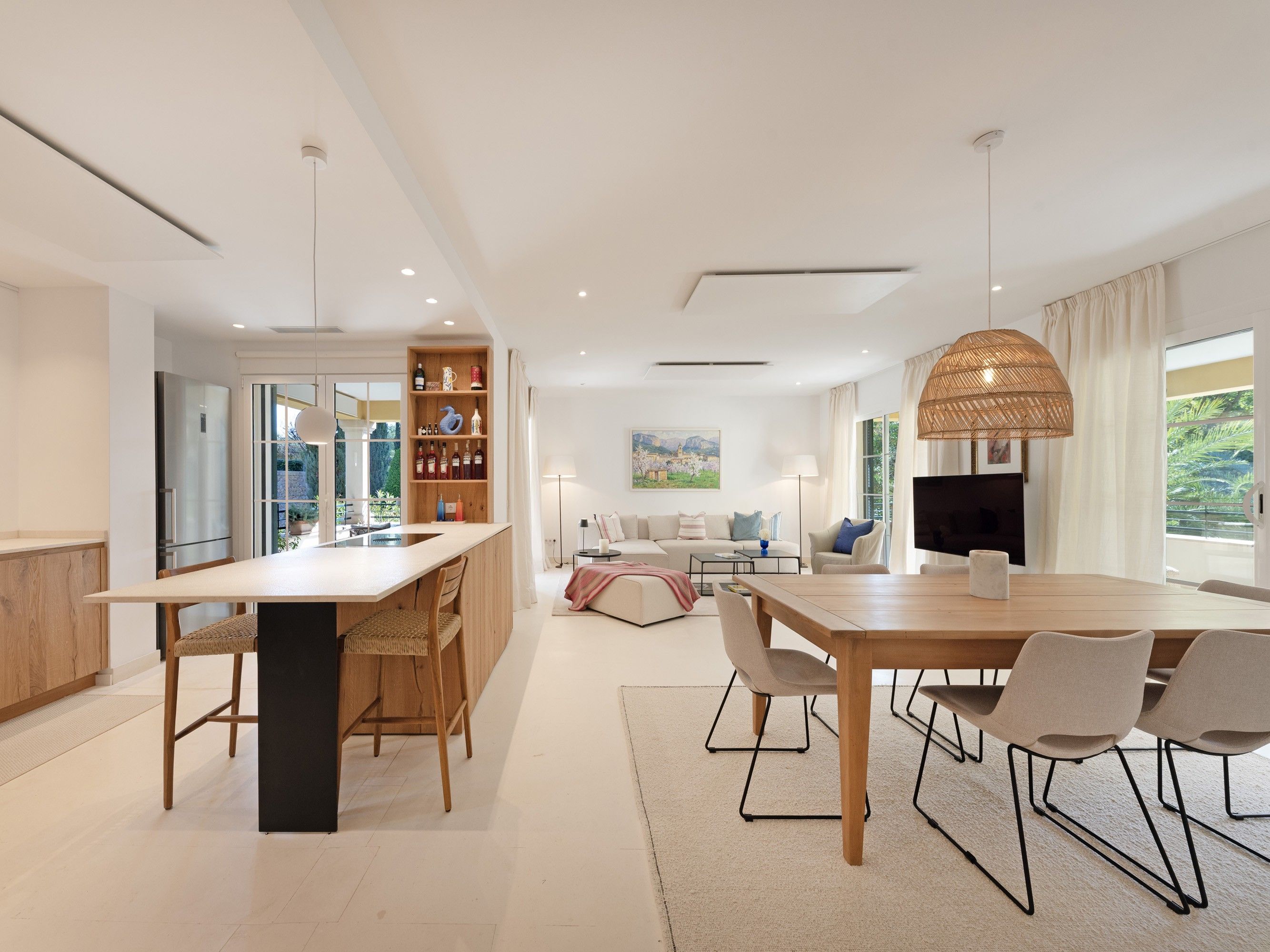 Z holu wejściowego wchodzimy do jasnego, otwartego salonu, który łączy funkcję wypoczynkową i jadalnianą z nowoczesną, w pełni wyposażoną kuchnią. Z salonu można wyjść na dwa tarasy: mniejszy, przytulny taras od strony wschodniej, idealny na poranną kawę, oraz większy taras od strony południowo-zachodniej, który doskonale sprawdzi się podczas spotkań towarzyskich z widokiem na zieleń i śródziemnomorski krajobraz.
