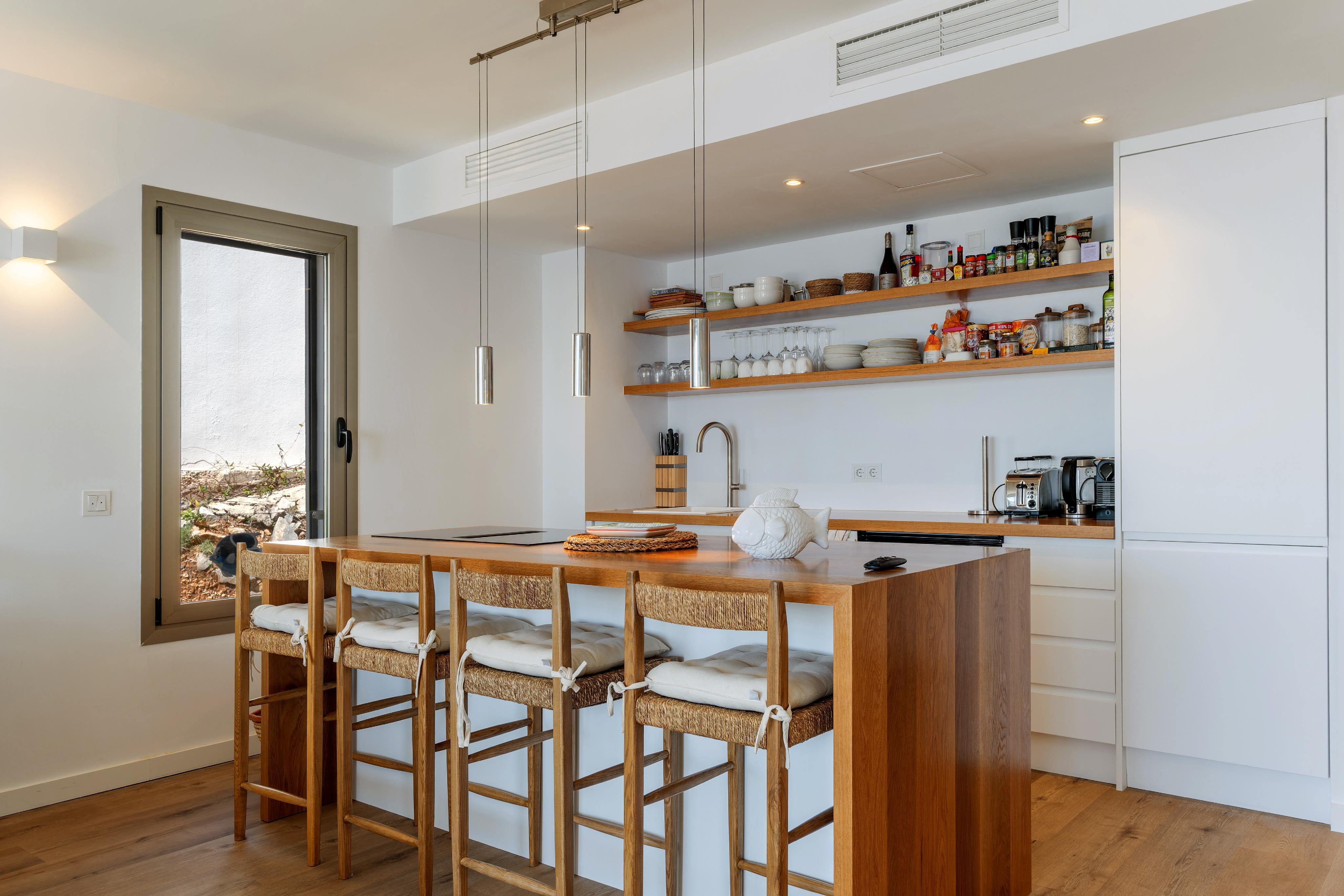 Wnętrze apartamentu obejmuje dwie komfortowe sypialnie i dwie eleganckie łazienki, w tym jedną przylegającą do sypialni głównej. Znajduje się tu również nowoczesna, w pełni wyposażona kuchnia oraz przestronny, otwarty salon z jadalnią. Wnętrze uzupełniają drewniane i kamienne podłogi, a także nowoczesne udogodnienia takie jak ogrzewanie podłogowe, centralna klimatyzacja z funkcją chłodzenia i ogrzewania oraz elektryczny kominek.