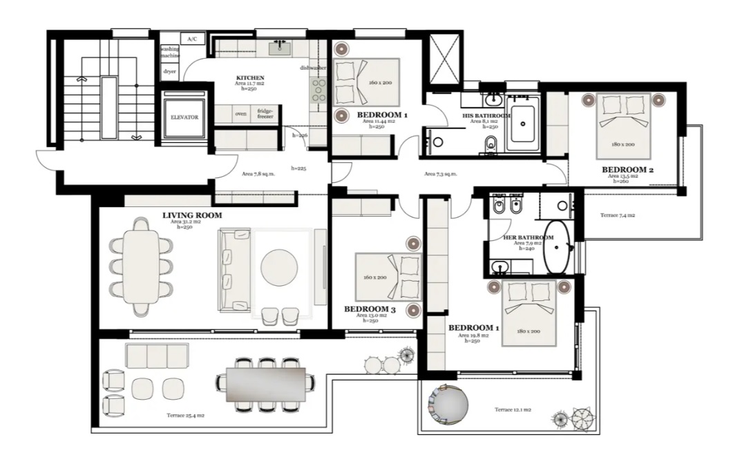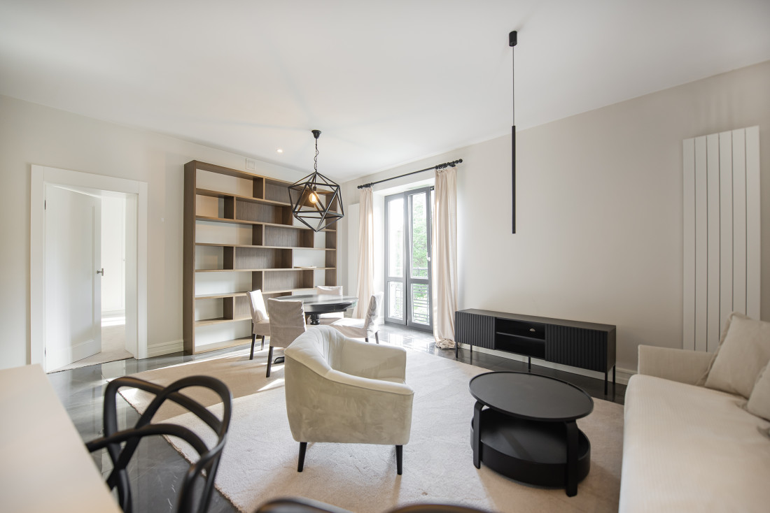 Apartament został wykończony z dużą dbałością o detale, zastosowano wysokiej klasy materiały wykończeniowe, a komfort codziennego życia zapewniają centralna klimatyzacja i ogrzewanie podłogowe, co sprawia, że nieruchomość doskonale sprawdza się zarówno latem, jak i zimą. W pełni wyposażona kuchnia z nowoczesnym sprzętem AGD renomowanej marki Miele to doskonałe miejsce do przygotowywania posiłków w domowym zaciszu.