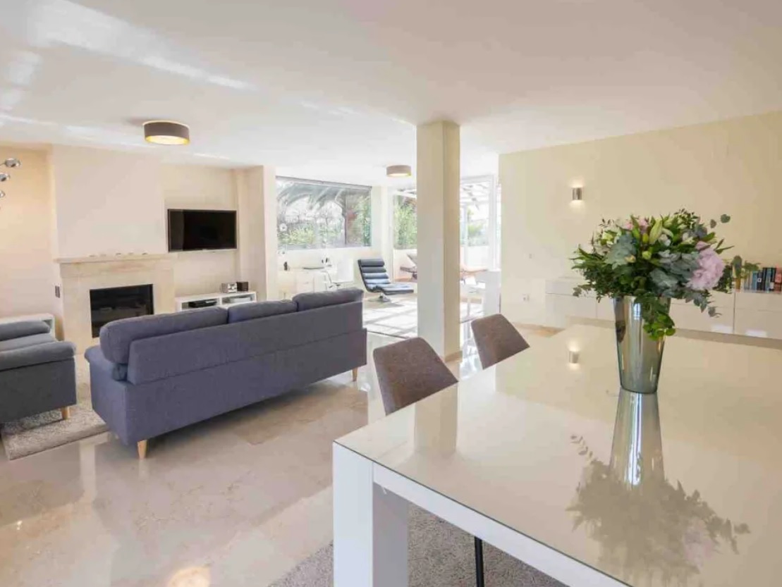 Centralnym punktem apartamentu jest jasny i przestronny salon z częścią jadalnianą, wyposażony w stylowy kominek, który tworzy przytulną atmosferę. Salon płynnie łączy się z imponującymi tarasami o łącznej powierzchni 45mkw, z których roztacza się panoramiczny, 360-stopniowy widok na Morze Śródziemne. Tarasy te stanowią idealne miejsce do wypoczynku i relaksu, pozwalając cieszyć się słońcem i śródziemnomorską bryzą przez cały rok.