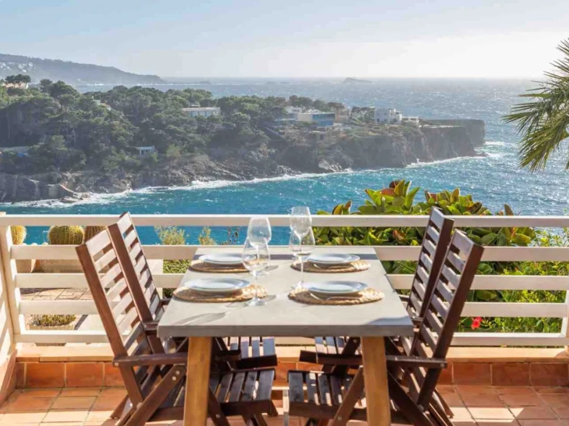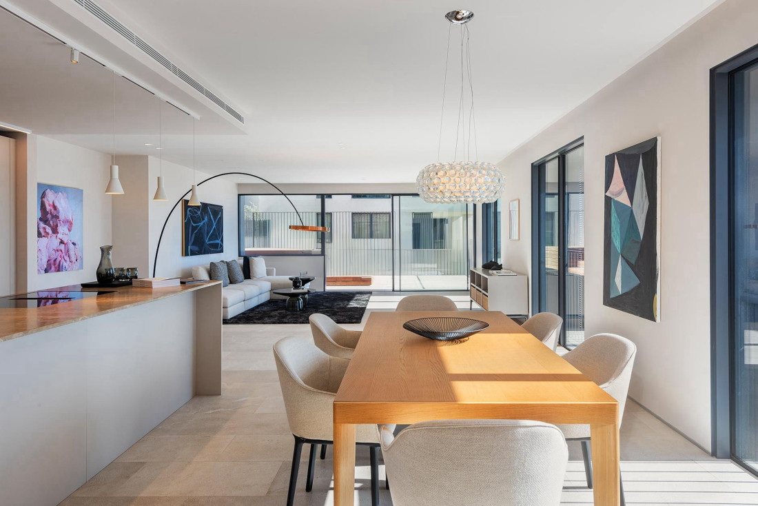 Centralnym punktem apartamentu jest jasny i przestronny salon z częścią jadalnianą, wyposażony w stylowy kominek, który tworzy przytulną atmosferę. Salon płynnie łączy się z imponującymi tarasami o łącznej powierzchni 45mkw, z których roztacza się panoramiczny, 360-stopniowy widok na Morze Śródziemne. Tarasy te stanowią idealne miejsce do wypoczynku i relaksu, pozwalając cieszyć się słońcem i śródziemnomorską bryzą przez cały rok.