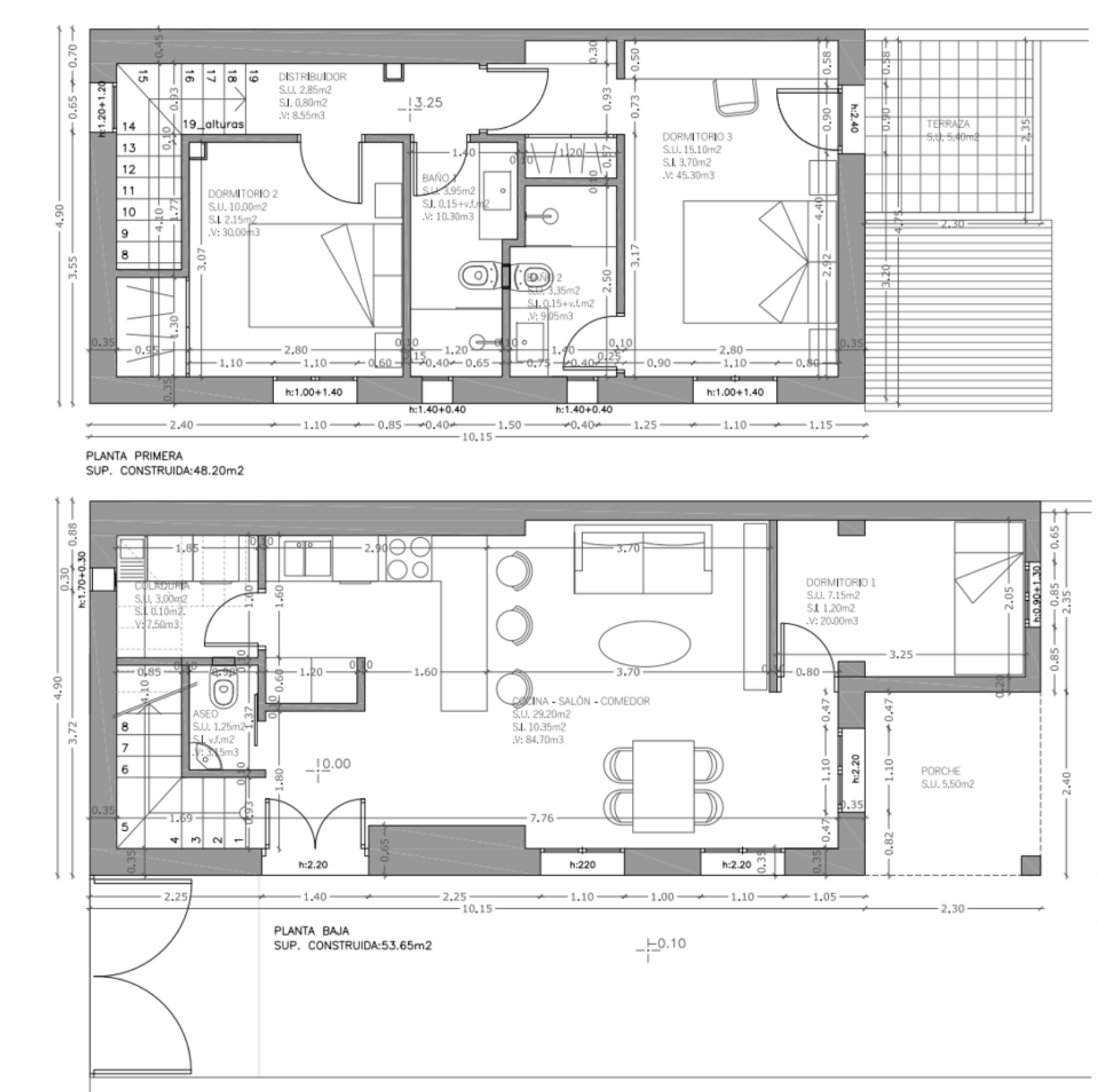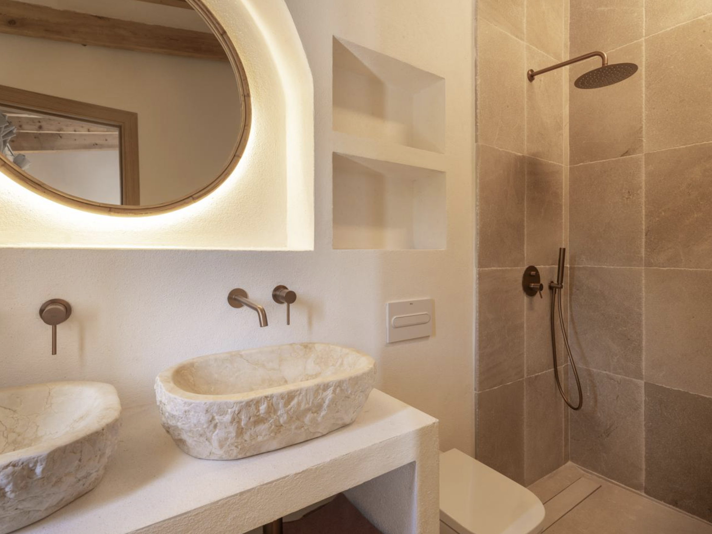 Piętro przeznaczone jest na część nocną i obejmuje dwie sypialnie dwuosobowe, każda z własną łazienką. Podłogi wyłożone są naturalnym sizalem, przyjemnym i ciepłym w dotyku, z wyjątkiem stref mokrych – łazienek i pryszniców – gdzie zastosowano elegancki marmur.