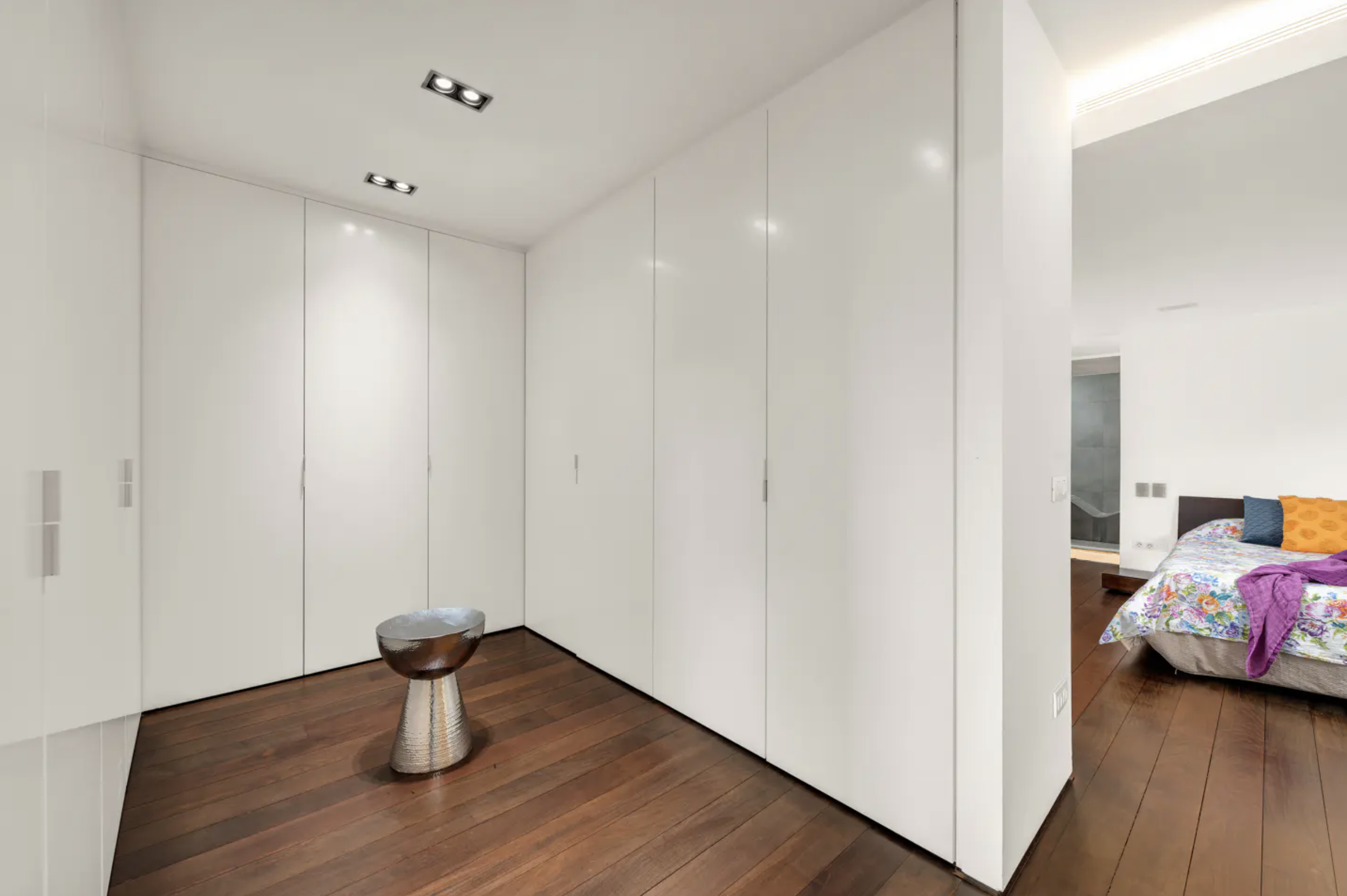 Apartament wyposażony jest w klimatyzację, system odkamieniania wody, oddzielną pralnię, a także miejsce postojowe w garażu podziemnym i pomieszczenie gospodarcze. Przemyślany układ pomieszczeń i duże przeszklenia sprawiają, że wnętrza są niezwykle jasne i pełne naturalnego światła.