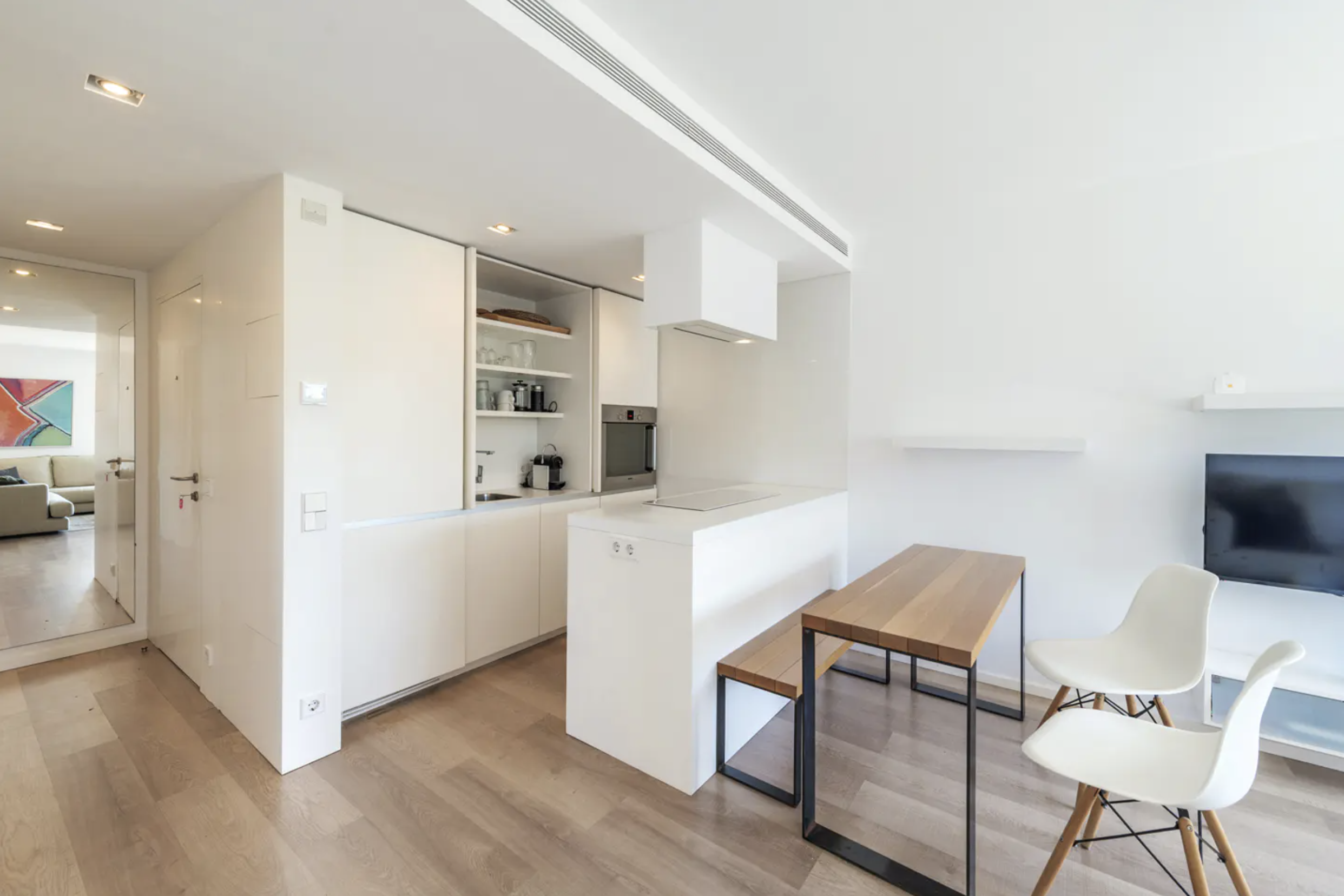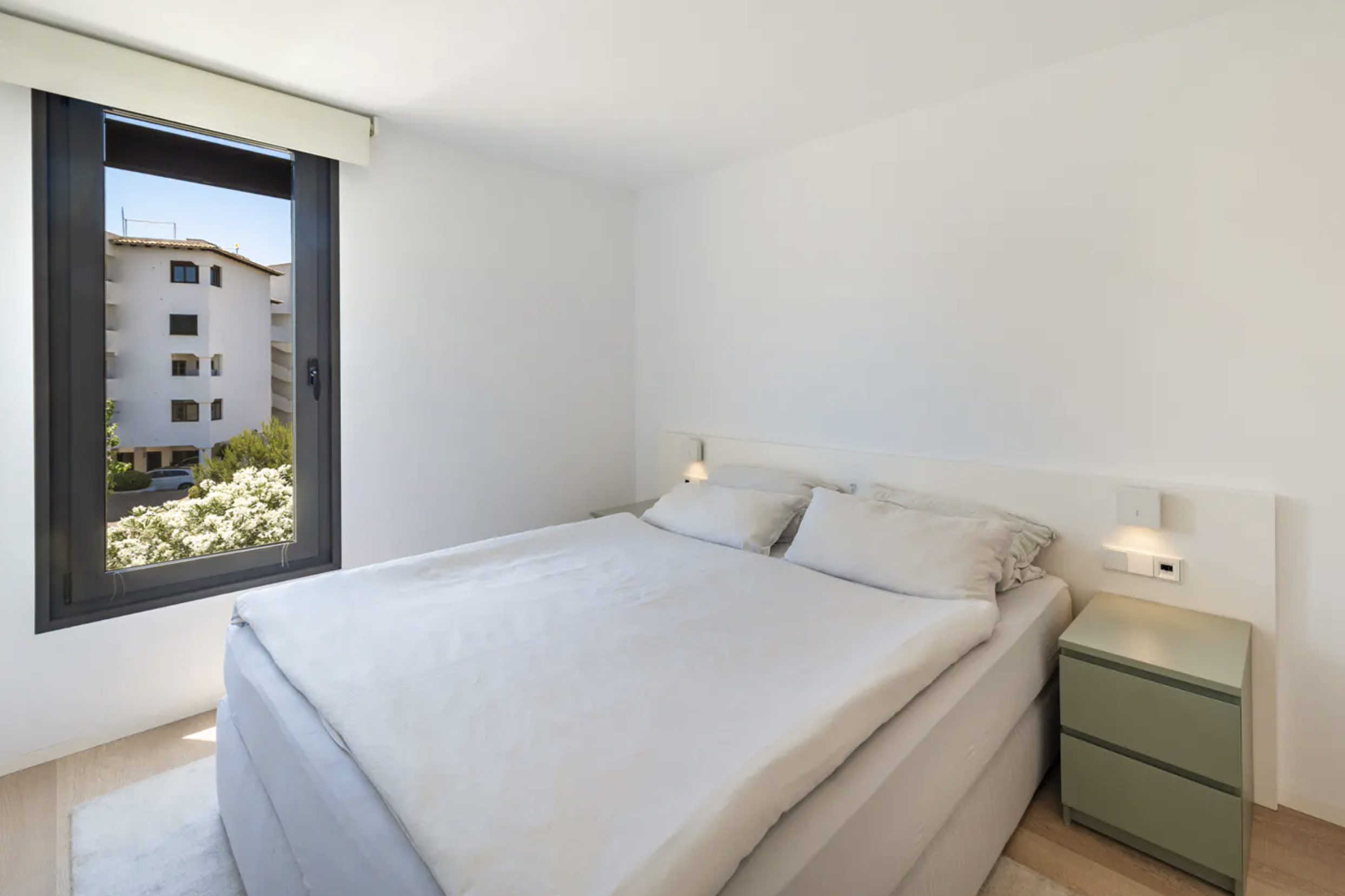 Wnętrze apartamentu obejmuje przestronną sypialnię główną, dodatkową sypialnię jednoosobową oraz stylową łazienkę z prysznicem typu walk-in. Otwarta strefa dzienna harmonijnie łączy salon, jadalnię i w pełni wyposażoną kuchnię, a duże przeszklenia prowadzą na balkon z panoramicznym widokiem na zatokę. Z tego miejsca schody prowadzą na prywatny, słoneczny taras na dachu – idealny do relaksu, spotkań towarzyskich i korzystania ze śródziemnomorskiego stylu życia w pełni.