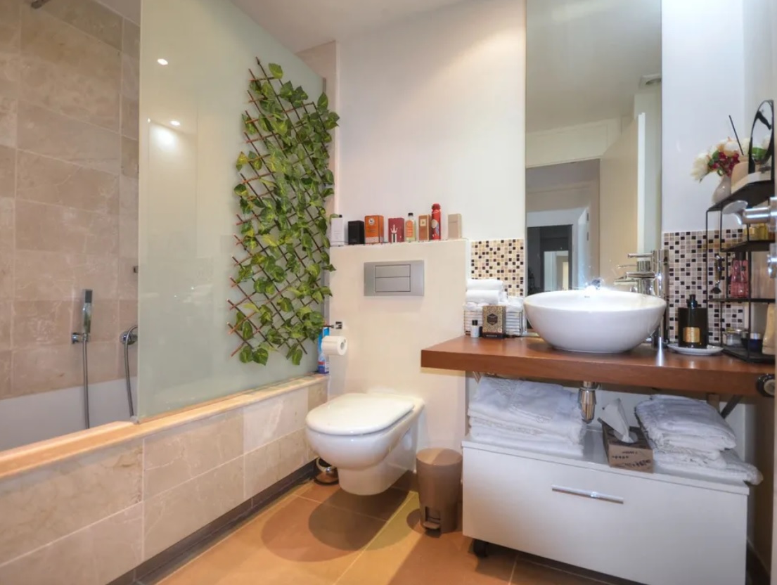 Zlokalizowany na pierwszym piętrze budynku z dostępem do windy, apartament zachwyca nowoczesnym wykończeniem i przestrzennym układem wnętrz. Na powierzchni mieszkalnej znajduje się elegancka strefa wejściowa z pojemną, wbudowaną szafą, która prowadzi do części sypialnej. Główna sypialnia z nowoczesną łazienką oferuje komfort i prywatność, natomiast druga sypialnia – idealna dla gości lub rodziny – korzysta z oddzielnej, również w pełni wyposażonej łazienki. Obie łazienki wykończono materiałami najwyższej jakości, łącząc nowoczesny design z funkcjonalnością.