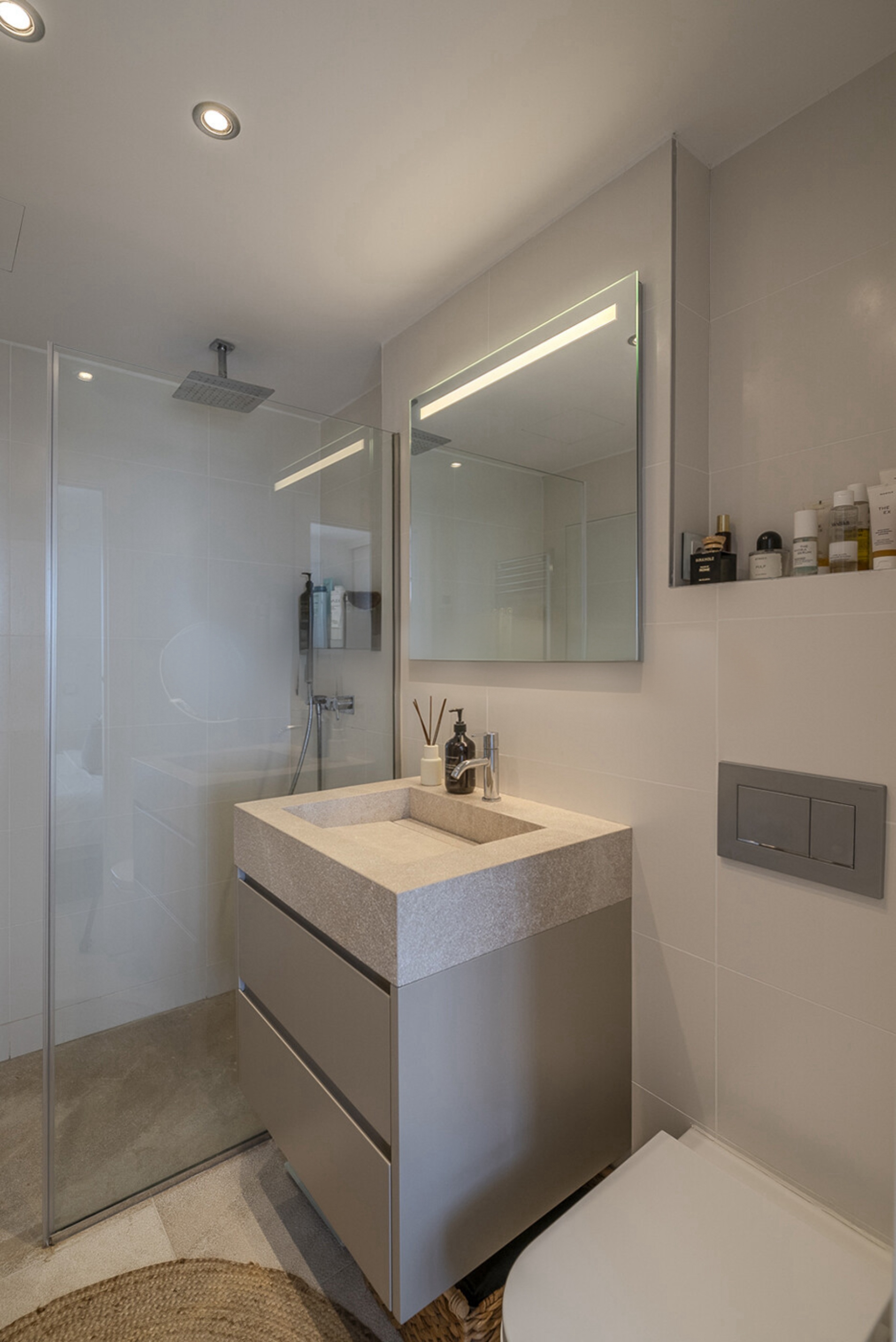 Apartament o powierzchni 82 m² z 36-metrowym prywatnym tarasem z ekspozycją południowo-zachodnią, wykończony został w wysokim standardzie. To idealne miejsce  do cieszenia się słońcem przez cały dzień z magicznym widokiem na Morze Śródziemne w tle. Apartament obejmuje przestronny salon z otwartą kuchnią, dwie przestronne sypialnie, każda z własną łazienką, zaprojektowane z myślą o komforcie i wygodzie, oraz pralnię. Zintegrowana klimatyzacja zapewnia przyjemną temperaturę przez cały rok, a ogrzewanie podłogowe w łazienkach dodaje luksusowego akcentu.