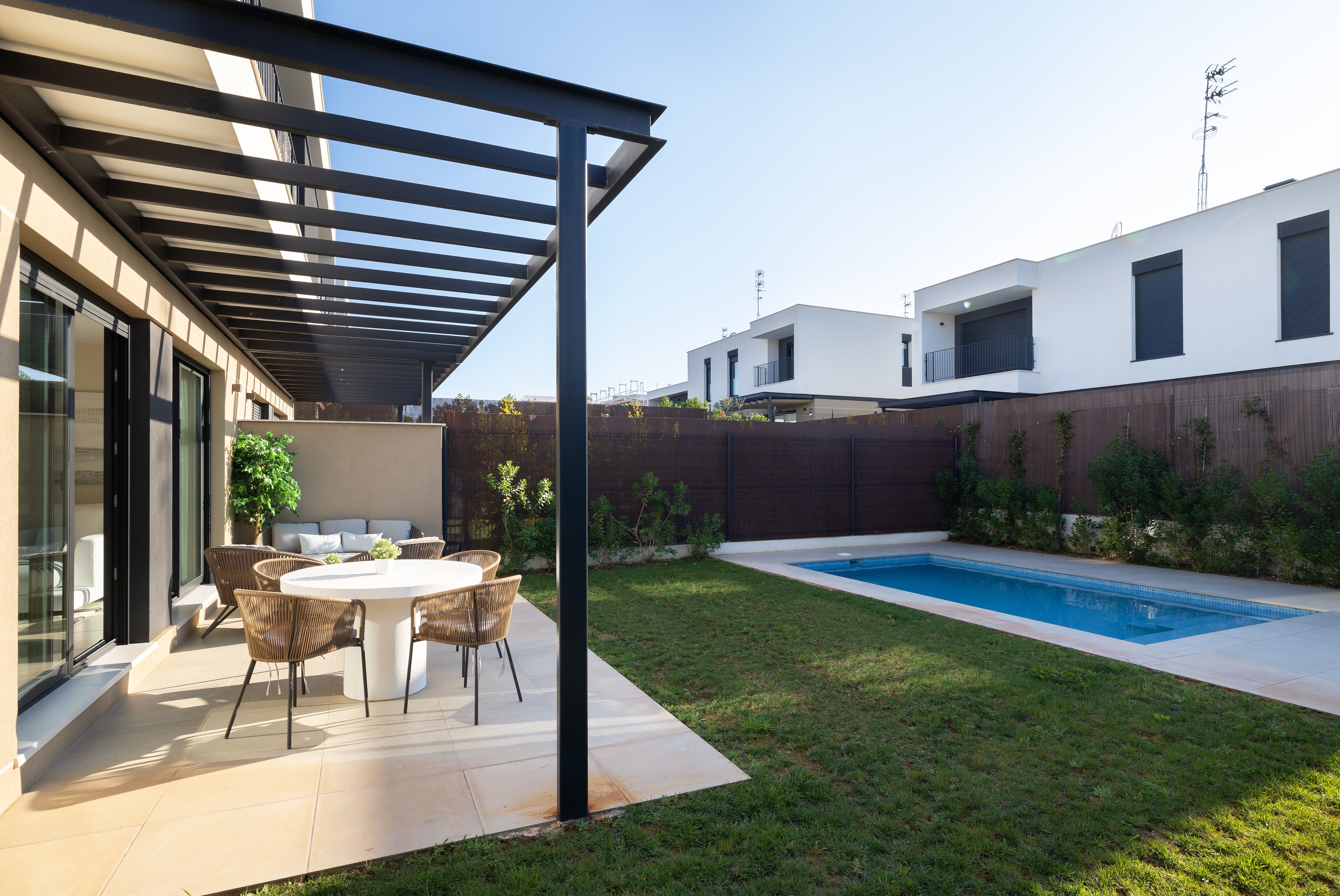 Dodatkowo, nieruchomość posiada basen z wodą morską o wymiarach 3×5, idealny dla bardziej naturalnych i zdrowszych kąpieli. Programowalny system nawadniania kropelkowego utrzymuje ogród w idealnym stanie, a elektryczne rolety zapewniają wygodę i bezpieczeństwo.