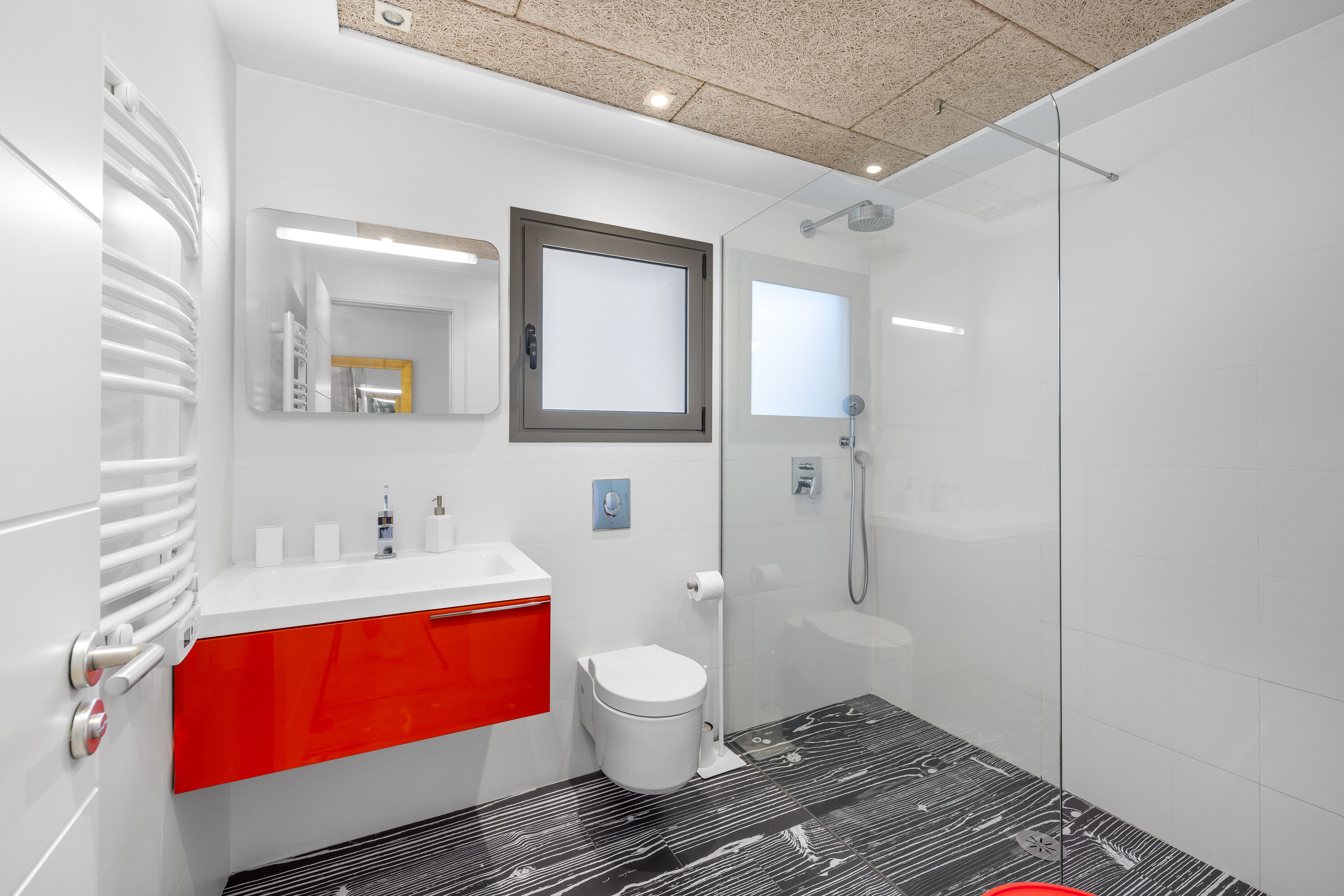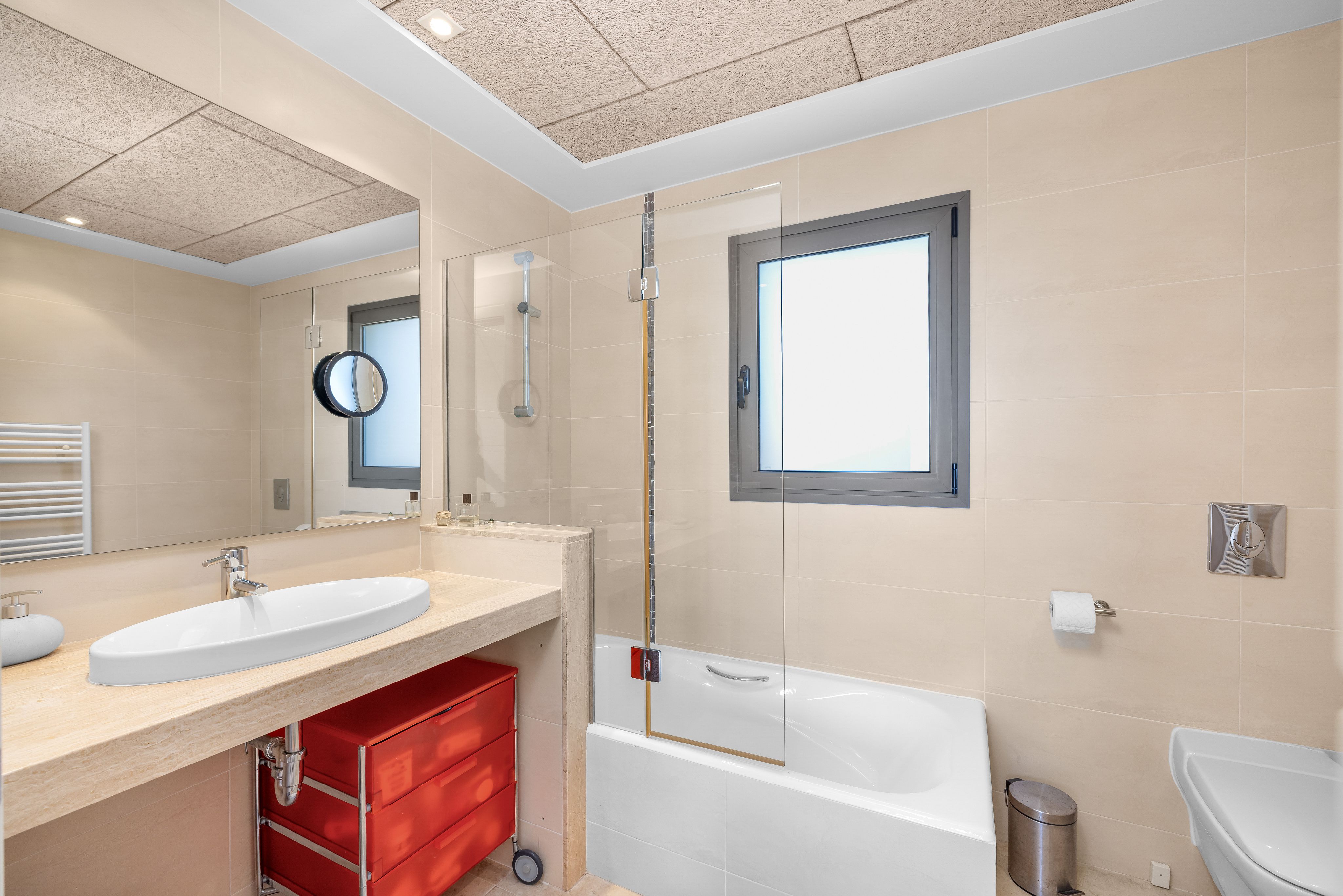Salon i jadalnia płynnie przechodzą w kuchnię, tworząc przestronną i spójną całość. Jasne kolory i ciepły parkiet nadają apartamentowi ponadczasową, przyjazną atmosferę z subtelnym śródziemnomorskim charakterem. Sypialnia główna posiada łazienkę en-suite, uzupełnioną o drugą, oddzielną łazienkę. Obie łazienki są zadbane i zaprojektowane w neutralnym, funkcjonalnym stylu. Komfort przez cały rok zapewniają klimatyzacja z funkcją ogrzewania i chłodzenia oraz winda zapewniająca wygodny dostęp do apartamentu.