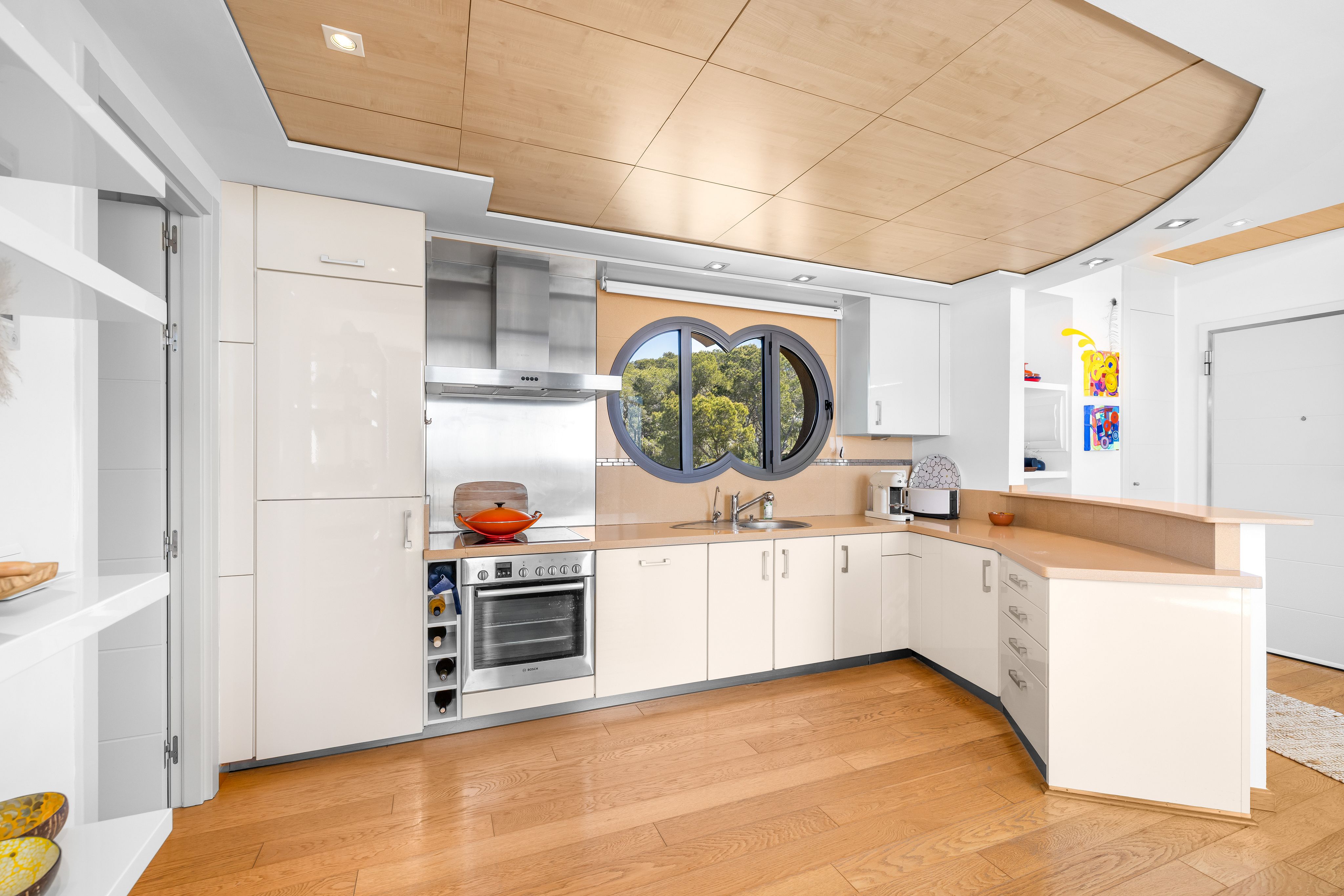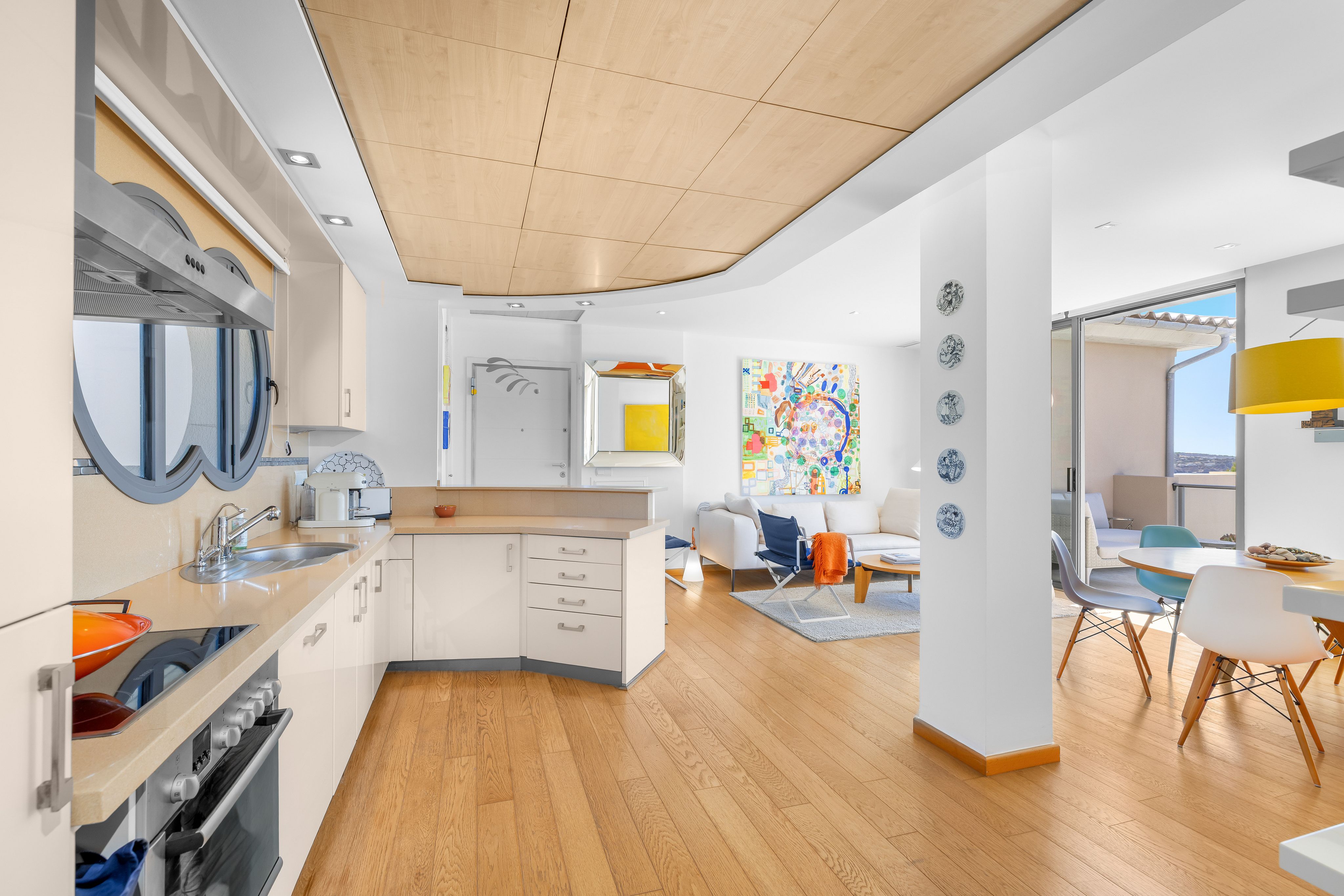 Już od momentu wejścia widać, że układ został starannie zaprojektowany: salon oraz obie sypialnie są w pełni zorientowane na morze. Duże okna wpuszczają naturalne światło do wnętrz przez cały dzień, tworząc jasną i otwartą atmosferę. Widoki rozciągają się wzdłuż wybrzeża, otoczonego górami, oferując rzadkie połączenie przestrzeni i spokoju.